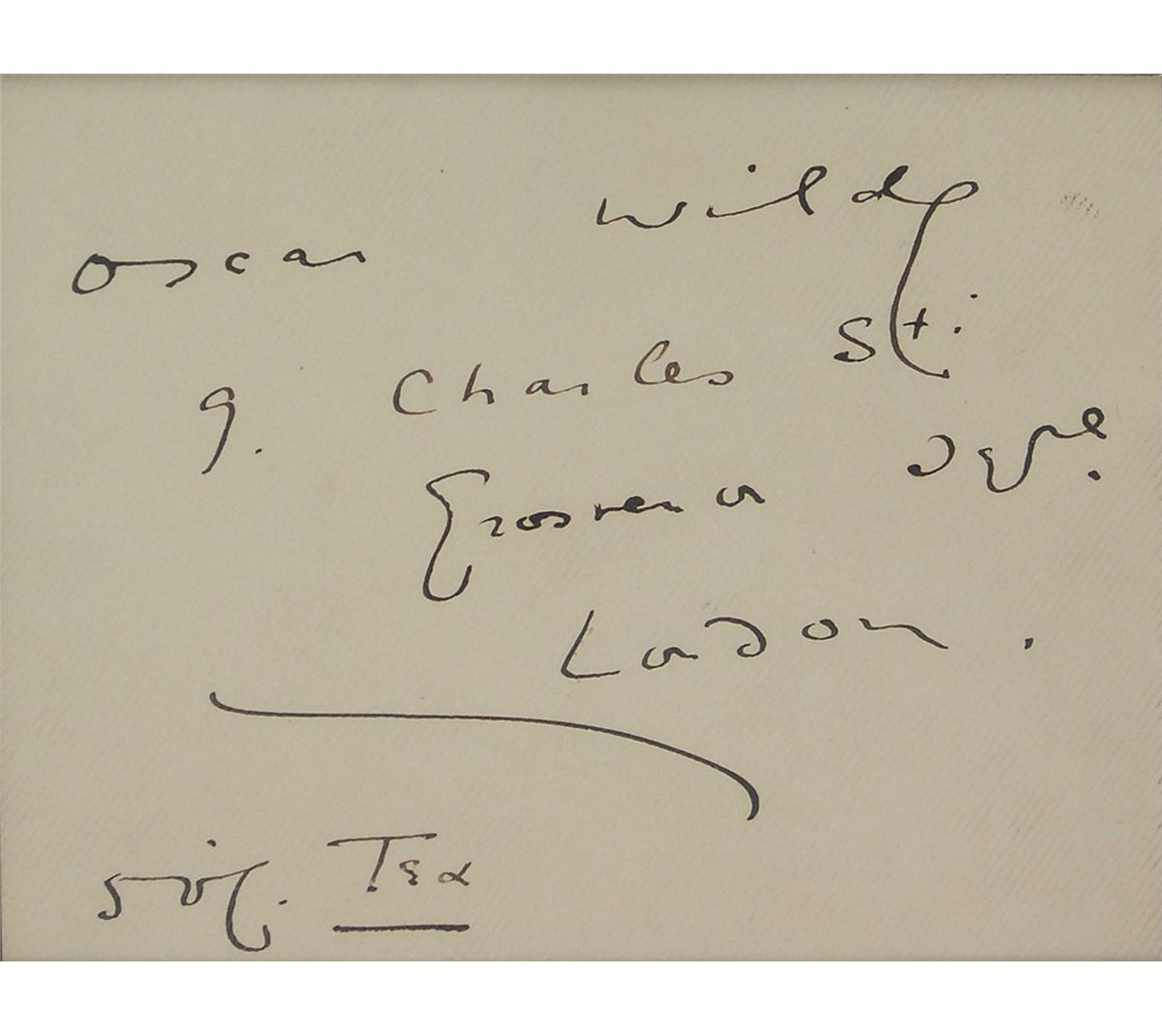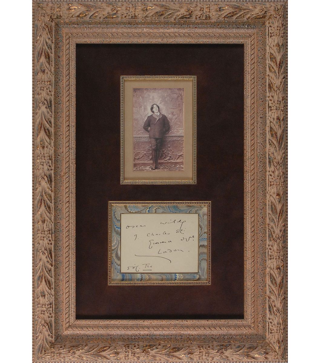 Irish writer (1854–1900) and leader of the Aesthetic Movement, known for such works as The Picture of Dorian Gray, The Importance of Being Earnest, and The Happy Prince. Ink signature, “Oscar Wilde, 9 Charles St., Grosvenor Square, London, 5 o’c Tea,” on an off-white sheet. Attractively and suitably double-suede-matted and framed with a full-length portrait of Wilde to an overall size of 15.5 x 22. In fine, clean condition.