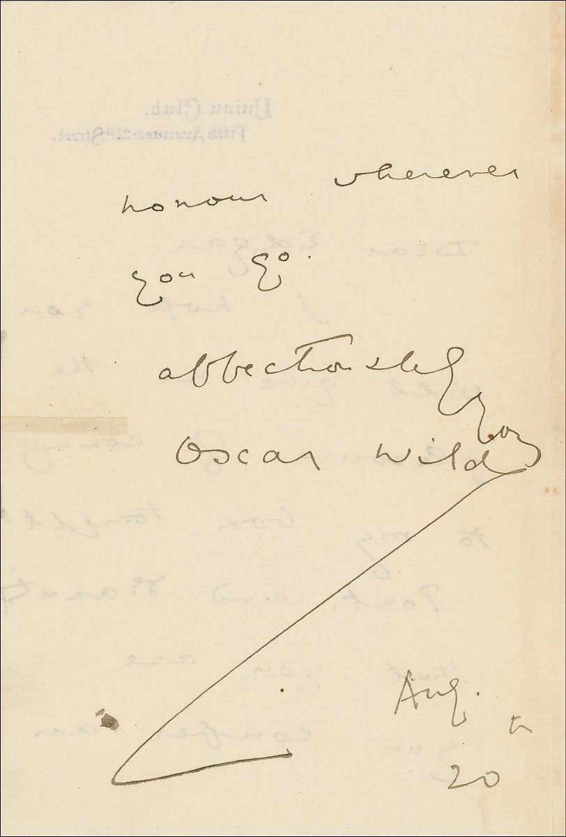 In an 1888 letter to editor Douglas Sladen, Wilde wrote glowingly of Fawcett: ‘The best of the young poets is Edgar Fawcett. I think him the best American poet there is—alive—but he is furious with me because I never answer his letters. If you are publishing an anthology you should not fail to use his work largely.’ A fantastic autograph boasting a fine literary association.