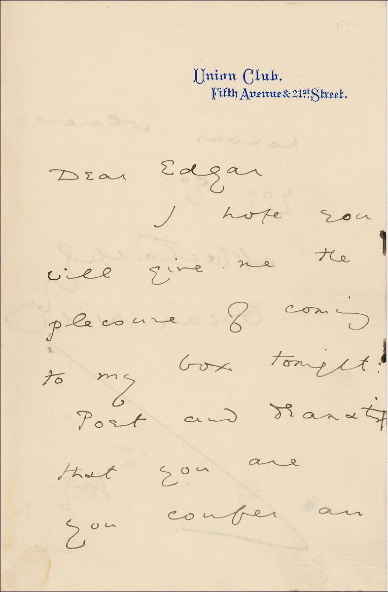 ALS, one page both sides, 4.5 x 6.75, Union Club letterhead, August 20, no year. Letter to poet Edgar Fawcett, in full: “I hope you will give me the pleasure of coming to my box tonight. Poet and dramatist that you are you confer an honour wherever you go.” In fine condition, with a faint stain to the lower corner and a neatly repaired edge separation at the central horizontal fold.