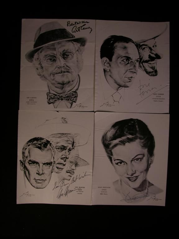 Set of four prints depicting Oscar winners in the roles which won them the coveted statue. Each is signed by the relevant performer. The signatures are of Jose Ferrer, Art Carney, Lee Marvin and Joan Fontaine.
