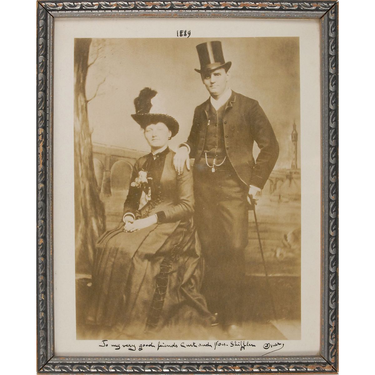 Oscar Tschirky (1866–1950) was maitre d'hotel of Delmonico's Restaurant and subsequently the Waldorf-Astoria, known for publishing a large cookbook. Vintage matte-finish 7.75 x 9.75 photo, signed and inscribed in black ink “To my very good friends Curt and Mrs. Schiffler, Oscar,” dating the photo 1889 at the top. Framed to an overall size of 8.75 x 10.75, also inscribed on the paper backing by Oscar, “To my dear Curt & Mary.” In fine condition. Accompanied by an original unsigned Christmas card from Tschirky with its original transmittal envelope.