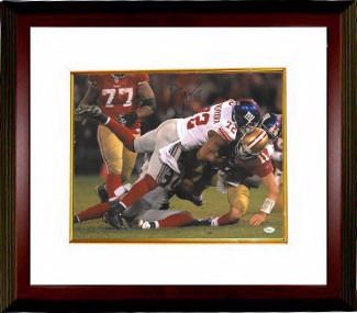 Osi"Umenyiora plays defensive end in the National Football League for the New York Giants. Umenyiora is one of three British-born players to have won a Super Bowl ring. Umenyiora has been selected for the Pro Bowl twice, and holds the Giants franchise record for most sacks in one game, coming against the Philadelphia Eagles in 2007. Osi Umenyiora has hand signed this New York Giants 16x20 Photo. JSA Hologram and Certificate of Authenticity. Custom White Mat and Premium mahogany Color Framed as shown