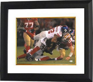 Osi"Umenyiora plays defensive end in the National Football League for the New York Giants. Umenyiora is one of three British-born players to have won a Super Bowl ring. Umenyiora has been selected for the Pro Bowl twice, and holds the Giants franchise record for most sacks in one game, coming against the Philadelphia Eagles in 2007. Osi Umenyiora has hand signed this New York Giants 16x20 Photo. JSA Hologram and Certificate of Authenticity. Custom White Mat and Premium Black Color Framed as shown