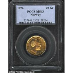 Oskar II Gold 20 Kroner 1876, KM355, MS63 PCGS. Important notice: We expect to be auctioning lots at the rate of 200-250 per hour. Sometimes eBay Premier live bid software cannot keep up with that pace, so we strongly recommend that you place a realistic proxy bid now as insurance to avoid disappointment. Also please note that all Heritage/CAA lots purchased through eBay Premier carry a 20% Buyer's Premium. Please make sure you read the Terms and Conditions.