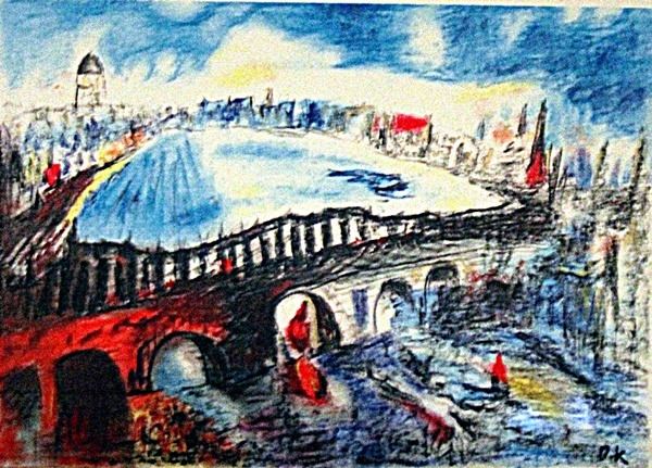 Pastel on paper in the manner of Oskar Kokoschka "The Bridge", circa 1909, private collection, unframed dimensions approximately 20x14. in the manner of Oskar Kokoschka, (born March 1, 1886, Pöchlarn, Austria—died February 22, 1980, Villeneuve, Switzerland) Austrian painter and writer who was one of the leading exponents of Expressionism. In his early portraits, gesture intensifies the psychological penetration of character; especially powerful among his later works are allegories of the artist’s emphatic humanism. His dramas, poems, and prose are significant for their psychological insight and stylistic daring.
