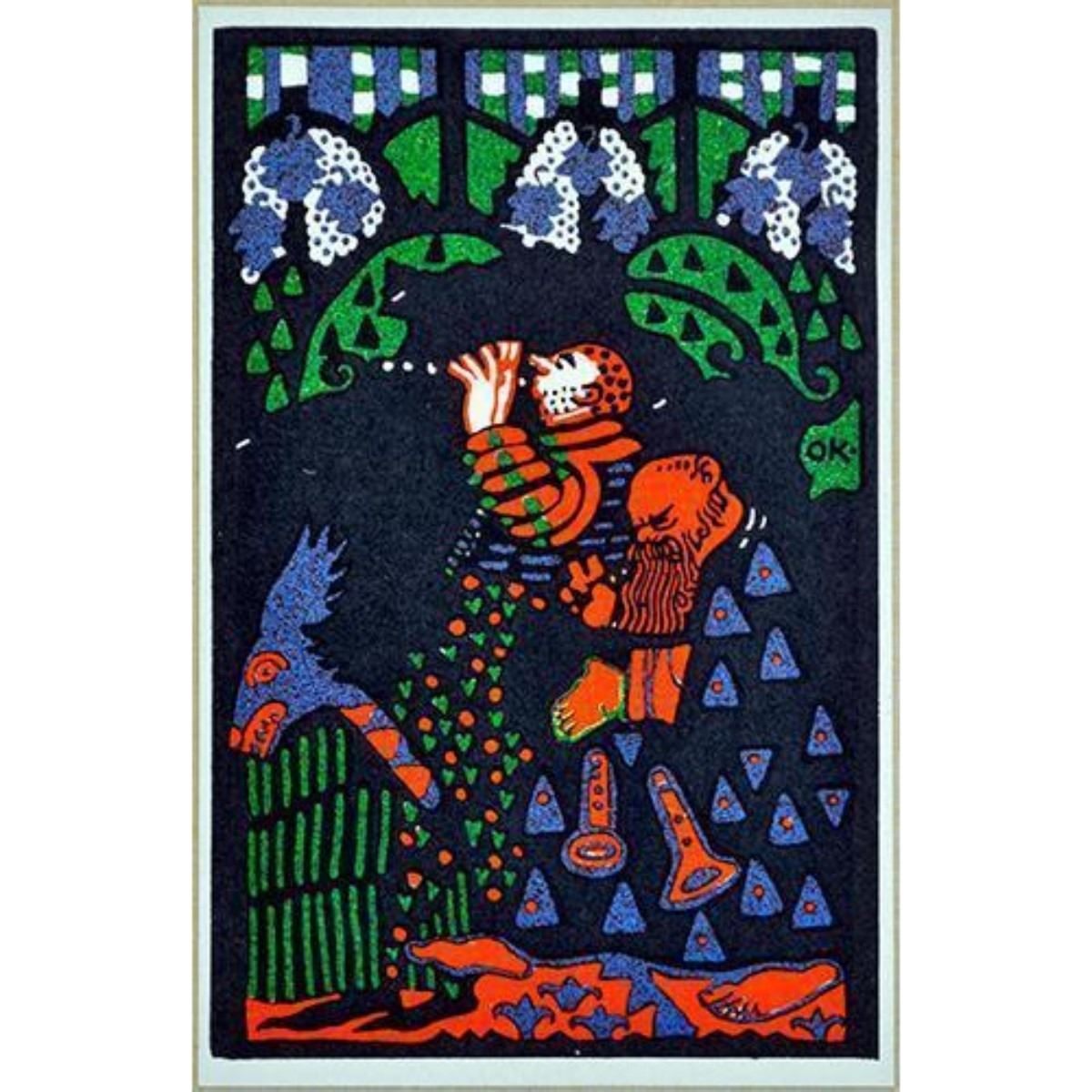 Lithograph postcard by Oskar Kokoschka (1886-1980) from the suite "Wiener Werkstatte" published by Cosmopress in an edition of 1000 printed in Germany, 1976. The use of bright colors and strong form are indicative of lithographs produced in the period.  3.5â€W X 5.5â€H