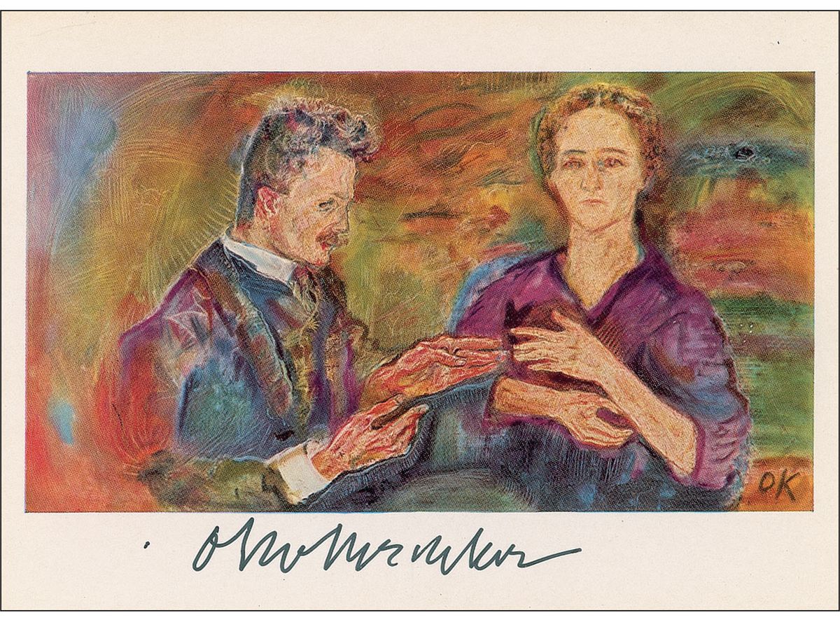 Color postcard featuring Kokoschka’s 1909 painting, ‘Portrait of Dr. Tietze and His Wife,’ 6 x 4, signed on the front in the bottom border in black felt tip. In fine condition, with some trivial toning.