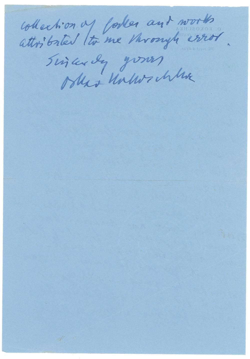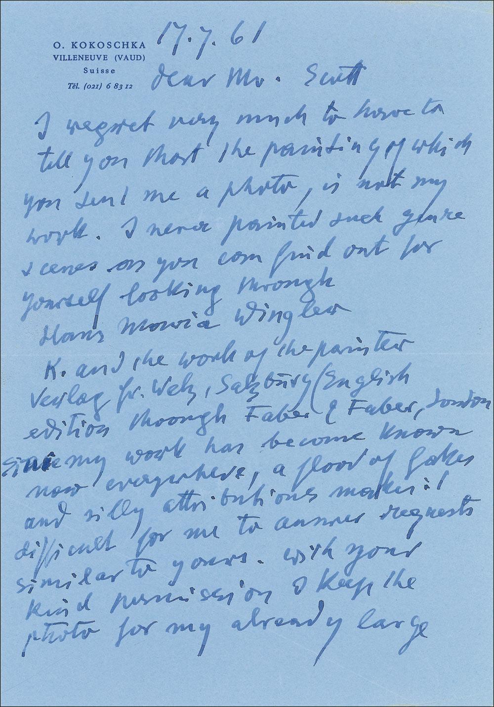 Austrian painter and poet (1886–1980) best known for his distinctively expressionistic portraits and landscapes. ALS in German, one page both sides, 5.75 x 8.25, personal letterhead, July 17, 1961. Letter to Benton Scott in Paris. In part (translated): “I regret very much to have to tell you that the painting of which you sent me a photo, is not my work. I never painted such genre scenes as you can find out for yourself looking through Hans Maria Wingler K[okoschka] and the work of the painter…Since my work has become known now everywhere, a flood of fakes and silly attributions makes it difficult for me to answer requests similar to yours. With your kind permission I keep the photo for my already large collections of fakes and works attributes to me through error…” In fine condition, with a few light creases and wrinkles. Accompanied by the original mailing envelope.