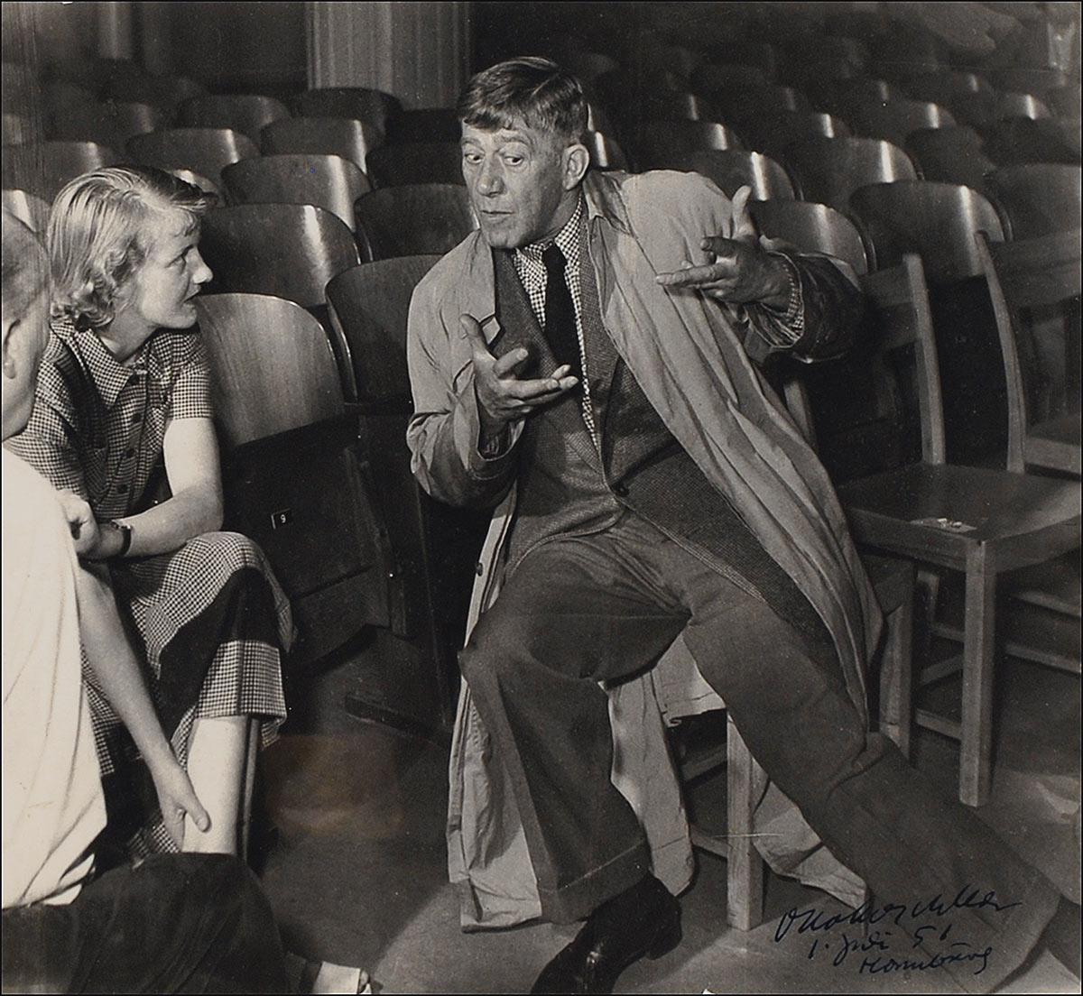 Austrian painter and poet (1886–1980) best known for his distinctively expressionistic portraits and landscapes. Vintage pearl-finish 12.25 x 11.5 photo of Kokoschka lecturing students in a theater, signed in fountain pen by Kokoschka, and dated, “1 Juli 51, Hamburg.” In very good condition, with trimmed edges, scattered creasing and edge wear, and a few surface marks and impressions.