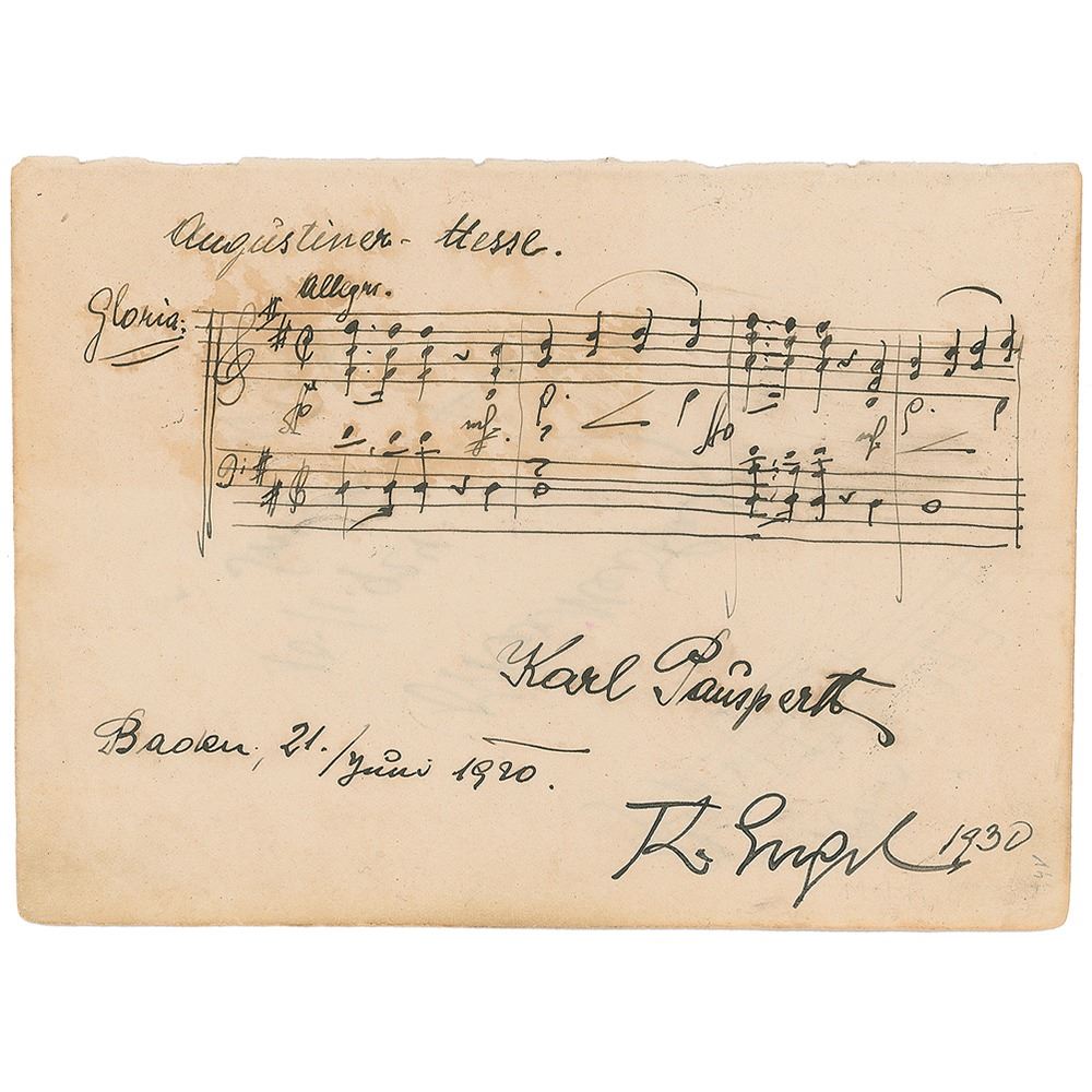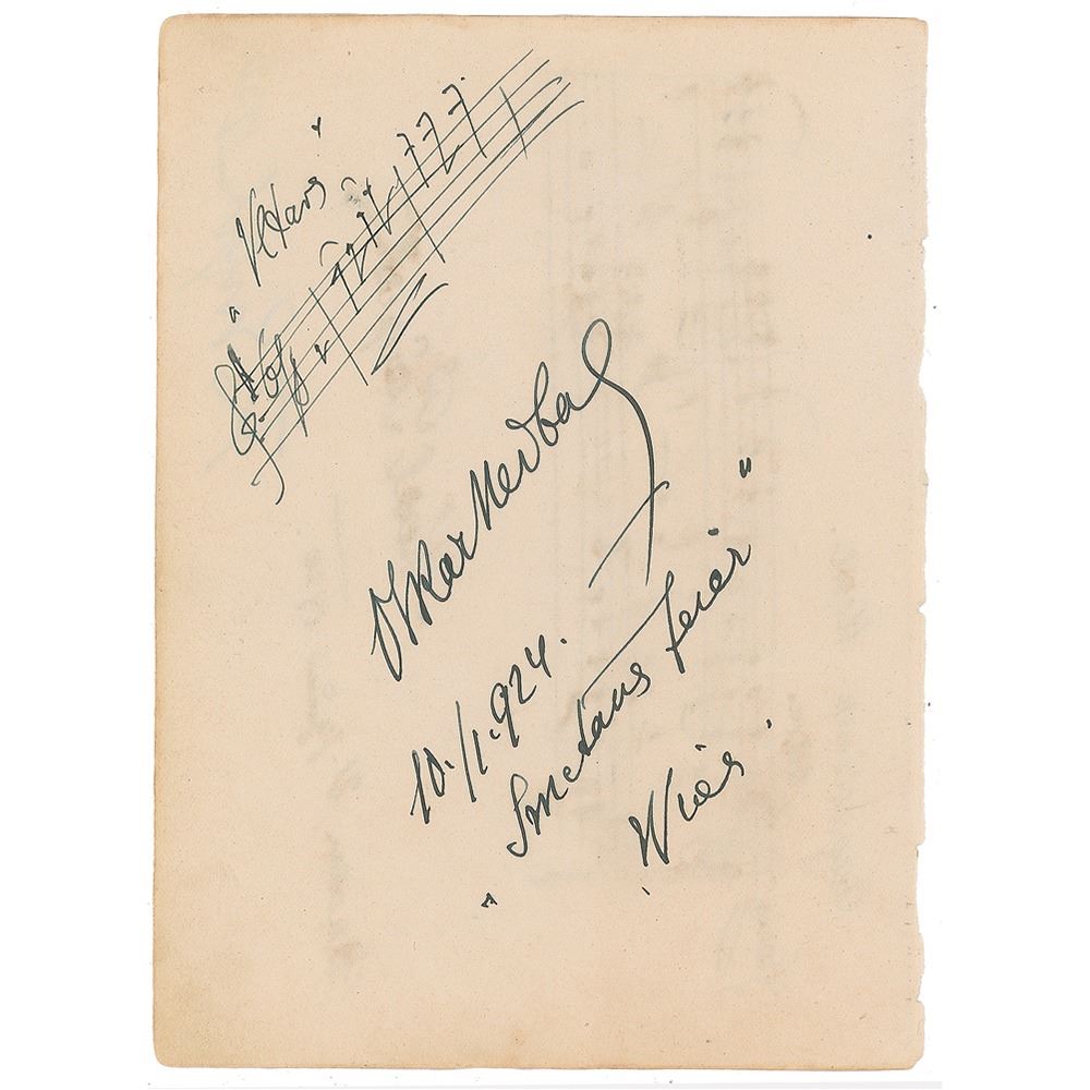 AMQS on an off-white 5 x 6.75 album page, signed below in ink, "Oskar Nedbal, 10.1.1924, Smetana Celebration, Wien." Nedbal pens four bars of music from Bedrich Smetana's 'Vltava [the Moldau].' On the reverse is an AMQS of Karl Pauspertl, last bandmaster of the famed Viennese Hoch und Deutschmeister Regiment, who pens four double-bars from the 'Gloria' of his 'Augustinian Mass,' at Baden, 21 June 1920. Below his signature is that of painter Theodor Engel. In fine condition, with show-through from writing on both sides.