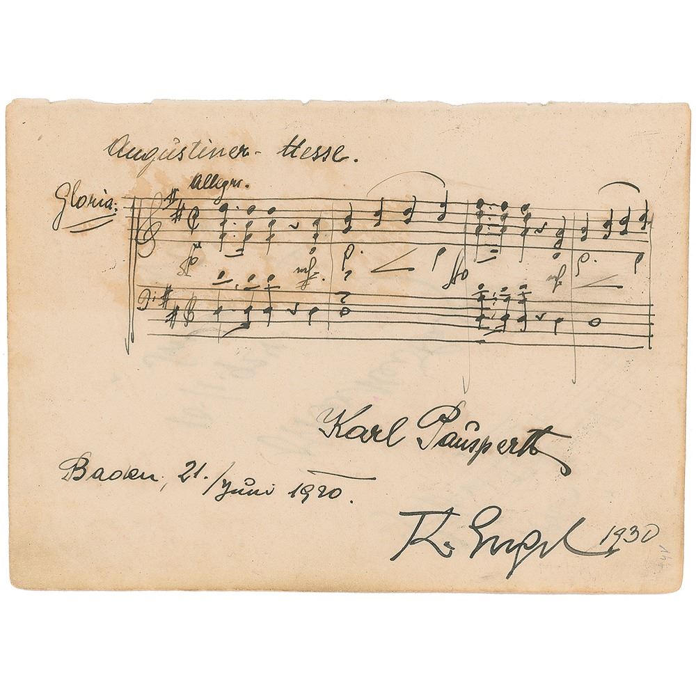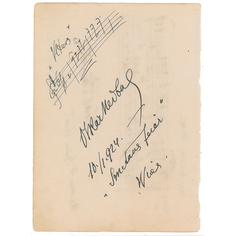 AMQS on an off-white 5 x 6.75 album page, signed below in ink, "Oskar Nedbal, 10.1.1924, Smetana Celebration, Wien." Nedbal pens four bars of music from Bedrich Smetana's 'Vltava [the Moldau].' On the reverse is an AMQS of Karl Pauspertl, last bandmaster of the famed Viennese Hoch und Deutschmeister Regiment, who pens four double-bars from the 'Gloria' of his 'Augustinian Mass,' at Baden, 21 June 1920. Below his signature is that of painter Theodor Engel. In fine condition, with show-through from writing on both sides.