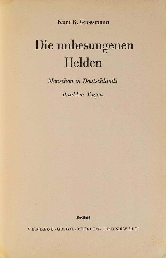 Signed book in German: The Unbesungen Helden [The Unsung Heroes] by Kurt R. Grossmann. First edition. Berlin: Arani, 1957. Hardcover with dust jacket, 5.25 x 7.5, 388 pages. Signed and inscribed on the half-title page in ballpoint to his wife Emilie in German (translated), "To my dear Mily, in remembrance of her courageous time, Oskar, Christmas, 1957, Frankfurt am Main." Autographic condition: fine, with a few tiny stains to signed page. Book condition: VG-/VG, with some staining around the edges of the cloth, and some skinning and degradation at the bottom of the spine, and areas of color variance to the dust jacket from light exposure.