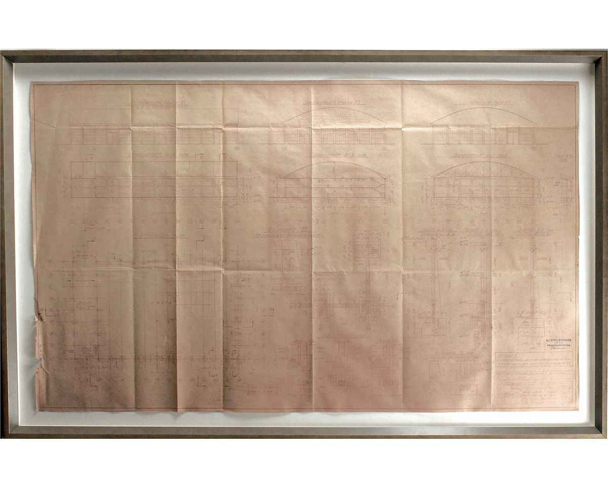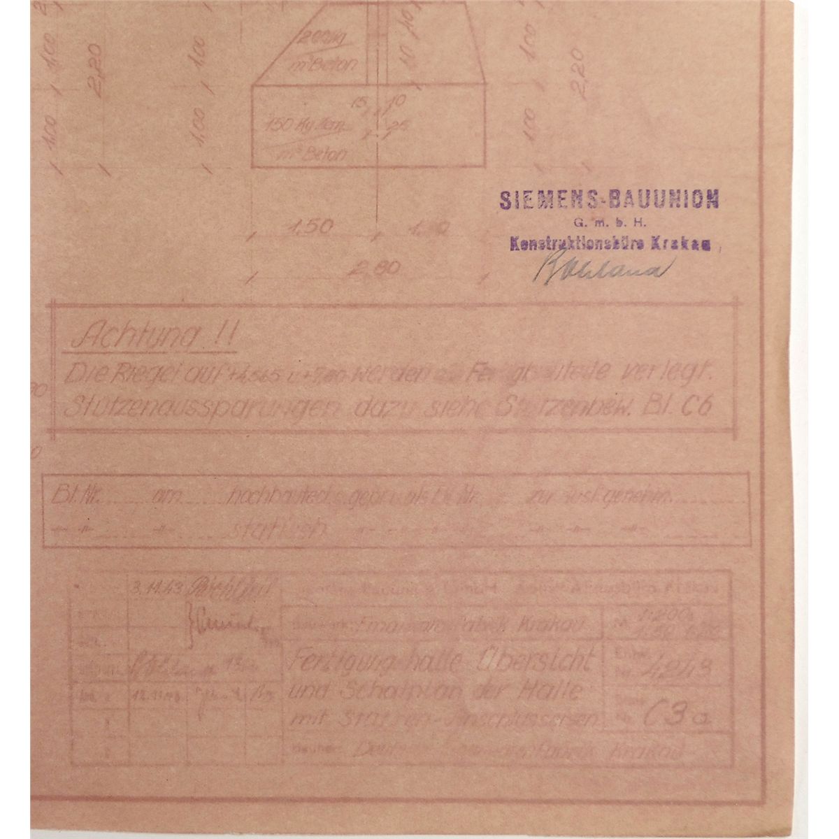 Historically important carbon or printed engineering plans in German that outline in great detail the specifics for Schindler's stamping factory at Emalia, on a large 44.5 x 27 sheet, dated November 15, 1943. These construction schematics show various angles of the exterior sides of the building as well as the foundation, T-joints, and supports. Plans bear a stamp to the lower right that reads, "Siemens-Bauunion G.m.b.H., Konstructionburo Krakau," endorsed below in an unknown hand. Framed to an overall size of 50 x 33. In well-preserved, fine condition, with intersecting storage folds and a few small chips and tears to the lower left (not affecting any diagrams). Lot is accompanied by a detailed report by historian David Crowe.