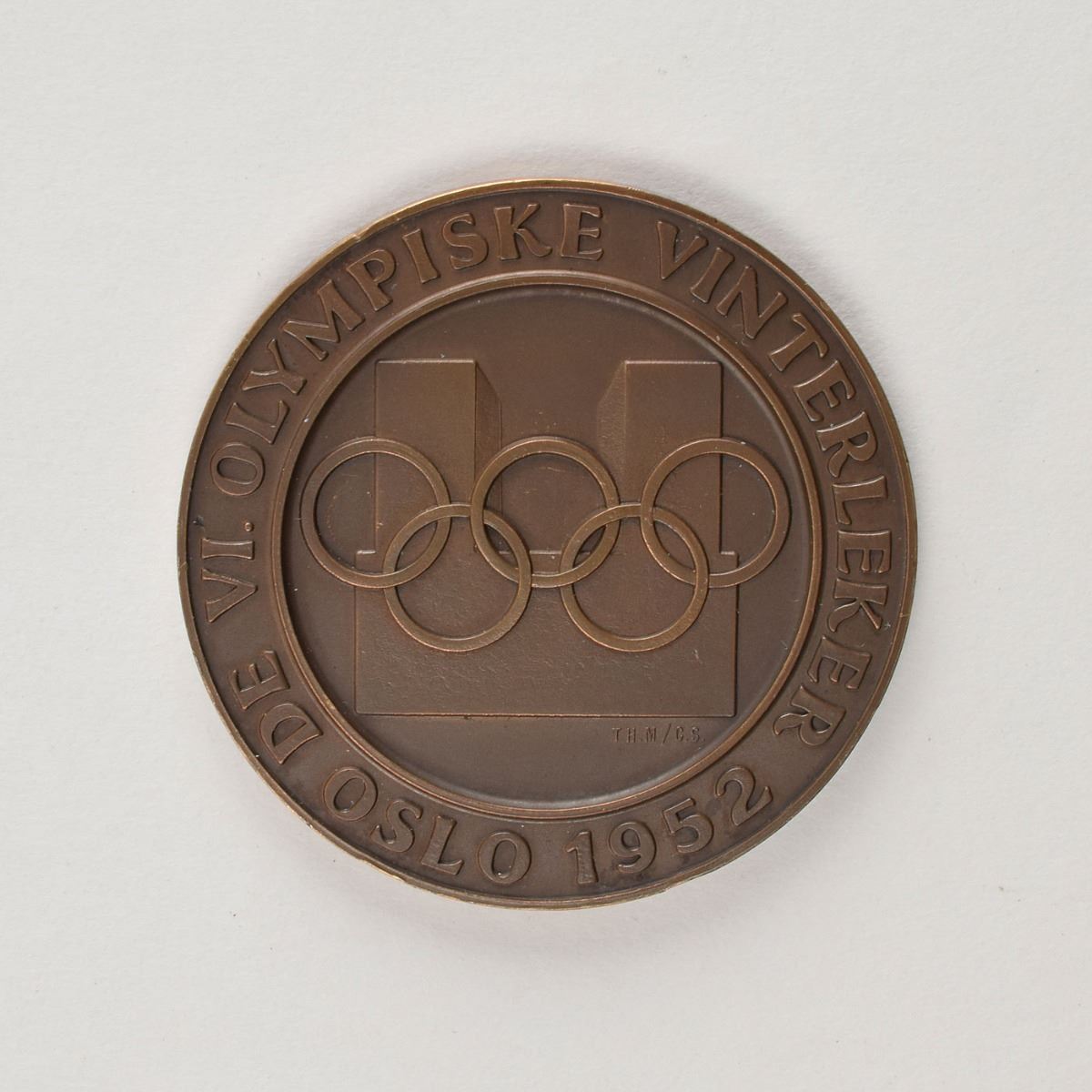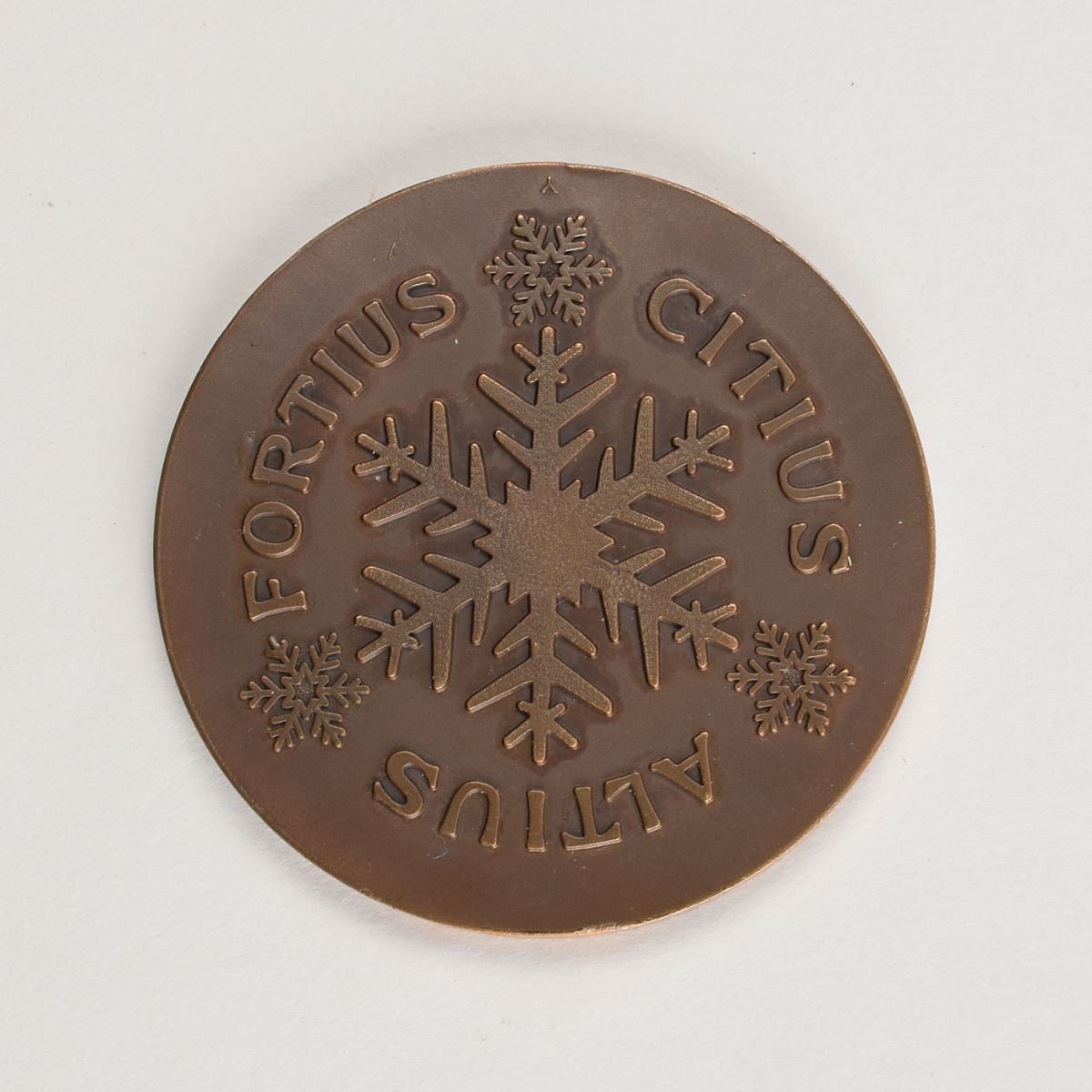 Participation medal issued for the 1952 Oslo Winter Olympics. Copper, 56 mm, 64 gm. The front features the Oslo Games logo encircled by raised text, “1952 Vinterleker Olympiske VI De Oslo”; the reverse, inscribed with the Olympic motto, “Citius, Altius, Fortius,” features one large and three small snowflakes.