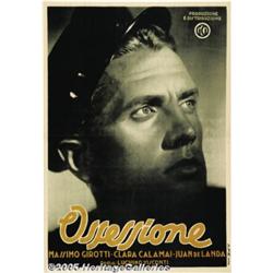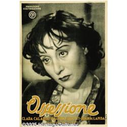 <B>Ossessione (Interfaith Committe, 1943)</B></I> Italian Posters (2) (19" X 27.25"). This was director Luchino Visconti's film adaptation of James M. Cain's acclaimed novel "Postman Always Rings Twice." In this version Massimo Girotti stars as the drifter who goes to work at the small provincial inn. Clara Calamai plays the wife of the abusive innkeeper, Juan De Landa, who eventually talks Girotti into killing her husband for the insurance money. Many consider this film to be one of the finest examples of Italian neo-realism ever produced. Offered in this lot are two Italian posters from this film that feature great bust shots of Girotti and Calamai. There is one horizontal center fold line on each poster. The poster of Calamai has several longer tears at the top, border nicks and a tape stain in the upper right corner. Fine on Linen. The poster of Girotti has a few light scuffs. Very Fine+ on Linen. 2 items