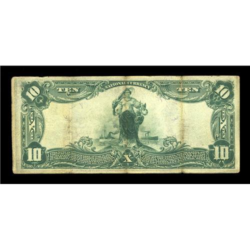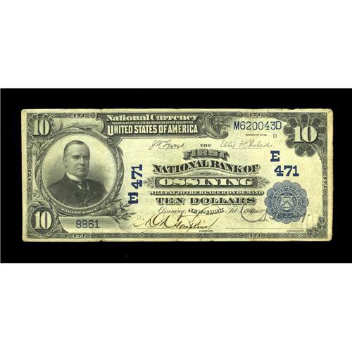 <B>Ossining, NY</B></I> - $10 1902 Plain Back Fr. 624 <B>The First NB </B></I> Ch. # (E)471<BR>Foldwise this note would be XF, but rough edges, hard folds and rounded corners make this a pleasing <B>Very Fine.</B></I> This interesting town in Westchester County is home to the famous Sing Sing prison. Only eleven notes are known for the second title.