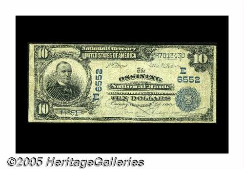 <B>Ossining, NY</B></I> - $10 1902 Plain Back Fr. 624 <B>The Ossining NB</B></I> Ch. # 6552<BR>This <B>Fine+++</B></I> is an old friend, having changed hands in our September, 2001 Greater Cincinnati Numismatic Expo Sale, where it realized $770. This scarce bank issued large only prior to its demise in 1926 and is from a strongly collected Westchester County locale. With demand for better Nationals even stronger today than when this example last crossed the auction block, we expect it will sell in the range of...