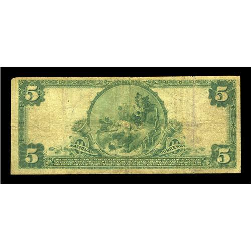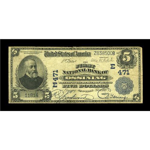 <B>Ossining, NY</B></I> - $5 1902 Plain Back Fr. 598 <B>The First NB </B></I> Ch. # (E)471<BR>A touch of edge fraying is noted on this solid, evenly circulated note. The still visible signatures remain quite bold. Less than a dozen examples of this title variation are known. <B>Very Good.</B></I>