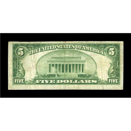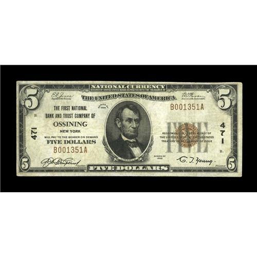 <B>Ossining, NY</B></I> - $5 1929 Ty. 1 <B>The First NB & TC</B></I> Ch. # 471<BR>This was the last of the three titles this strongly collected Westchester County institution employed on its emissions and was the only one to adorn its 1929 designs. Other than the notes from the #1 sheet, this is only the second $5 Type 1 to surface from here. The example we offer tonight is a nice <B>Fine,</B></I> free from any pinholes or other distractions.