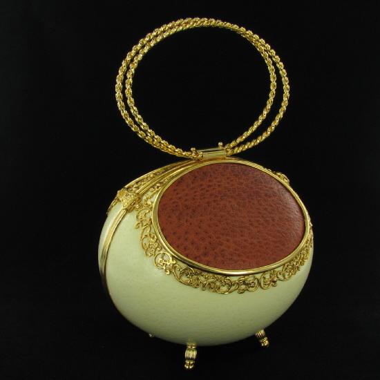 Excellent one-of-a-kind craftsmanship with gilded hardware; ostrich egg shell and skin; velvet lining; 10"; $1595 retail