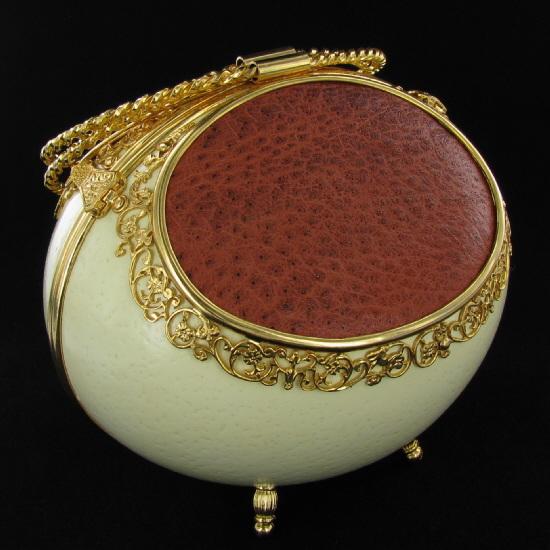 Excellent one-of-a-kind craftsmanship with gilded hardware; ostrich egg shell and skin; velvet lining; 10"; $1595 retail