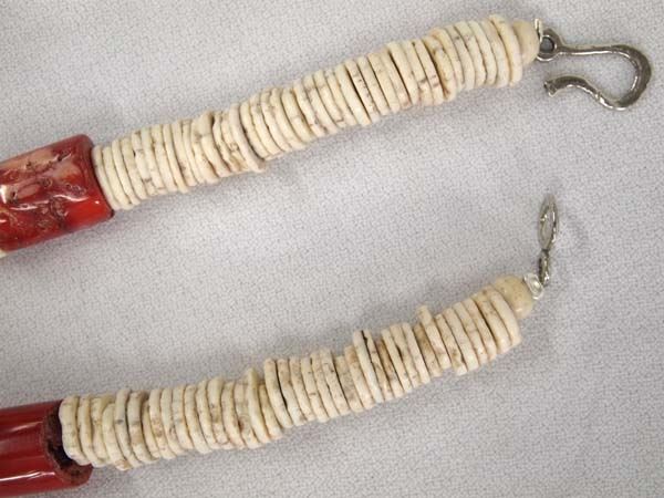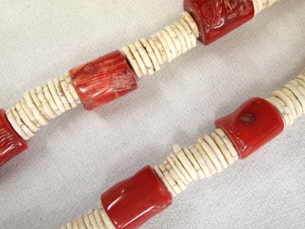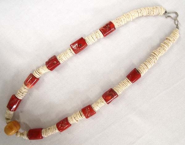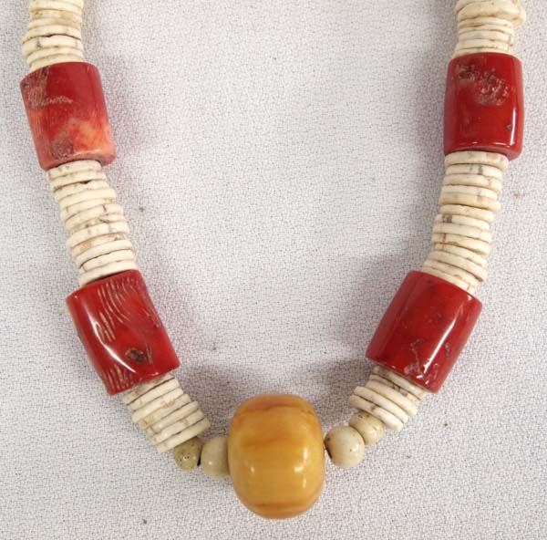 Ostrich Shell, Coral, and Amber Necklace, measures 26'' end to end, amber bead measures 1'' x .75''