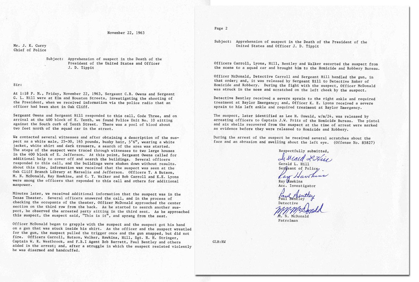 Souvenir arrest document of Lee Harvey Oswald signed by all four arresting officers: Gerald Hill, Ray Hawkins, Paul Bentley and M.N. McDonald. Document dated 22 November 1963 reads in part, ''...after obtaining a description of the suspect as a white male, 25-30, 165 pounds, bushy hair, 5'6'', a search of the area was started...Officer McDonald began to grapple with the suspect...'' Two page document, on two separate sheets measure 8.5'' x 11''. With additional letter of provenance showing photographs of the officers signing the document.