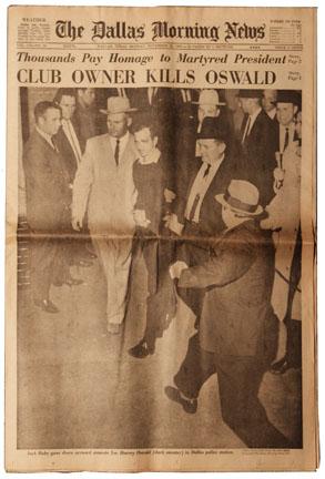 Complete ''Dallas Morning News'' 25 November 1963 edition, the day after Jack Ruby shot Lee Harvey Oswald, with front page headline reading: ''Thousands Pay Homage to Martyred President / CLUB OWNER KILLS OSWALD''. A large photo of Oswald being led through the basement of Dallas Police Headquarters covers the entire front page with caption reading: ''Jack Ruby guns down accused assassin Lee Harvey Oswald (dark sweater) in Dallas police station.'' Paper measures 15'' x 23'' with toning throughout and tiny tears forming along fold. Very good.
