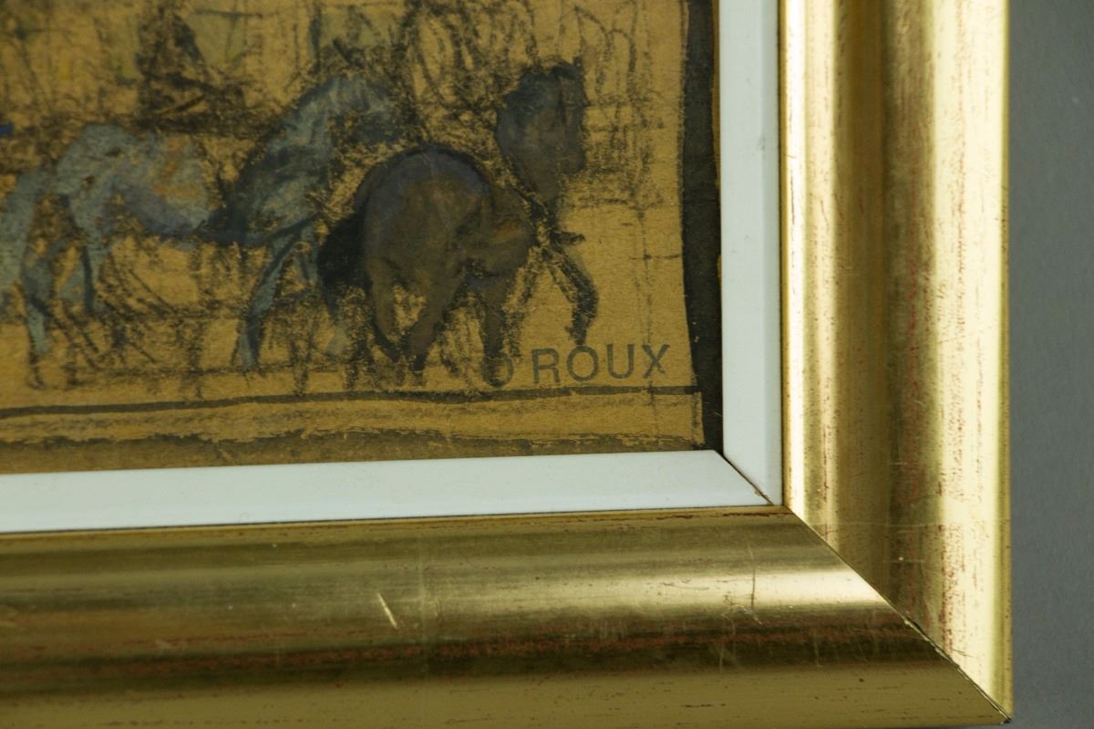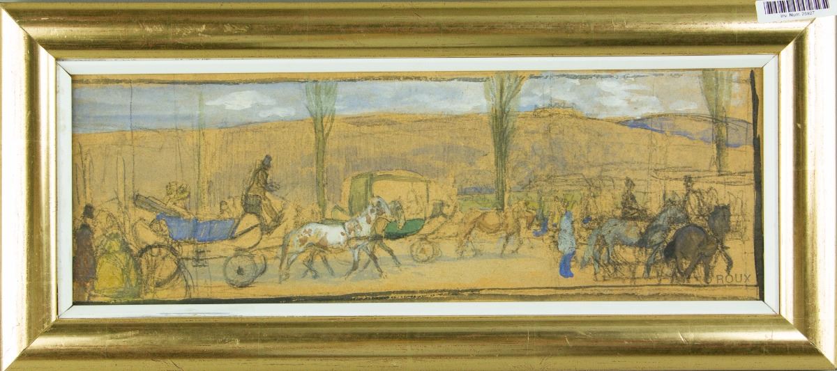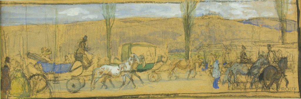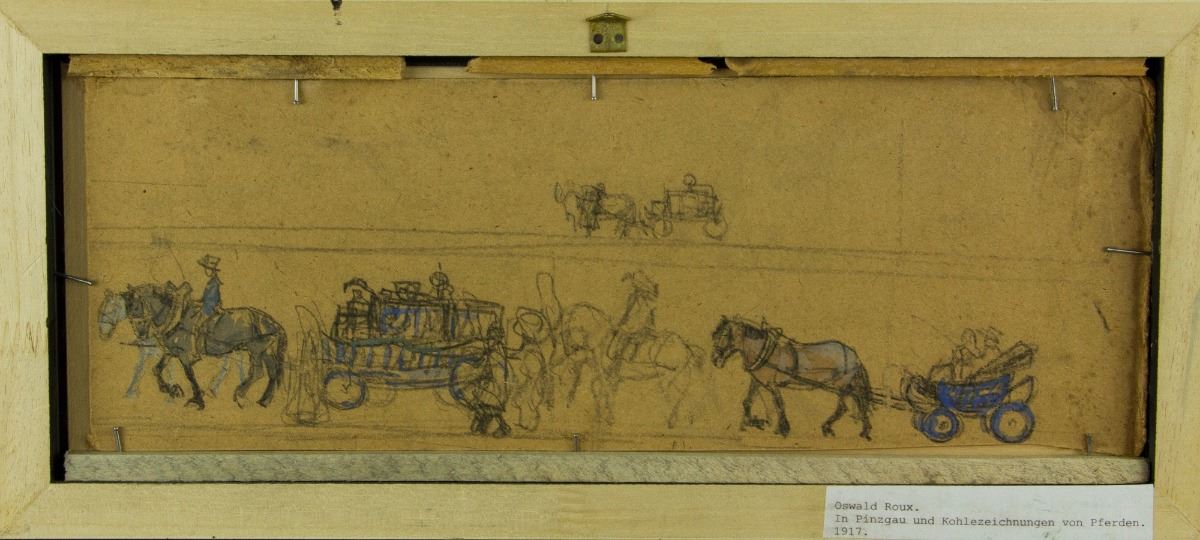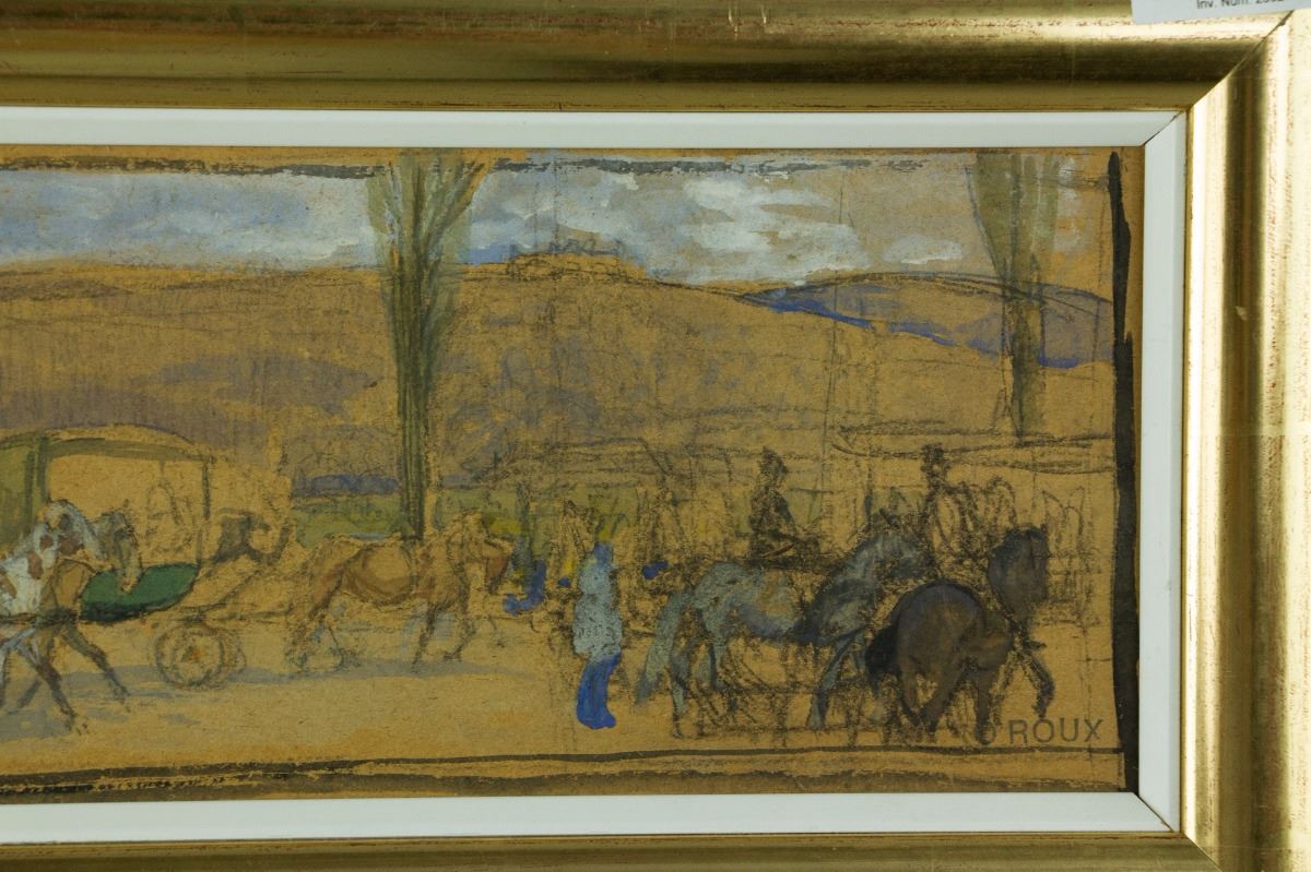 Horse wagons; watercolour on panel with frame; signed OROUX on lower right; with sketches on back; 37 cm × 13 cm