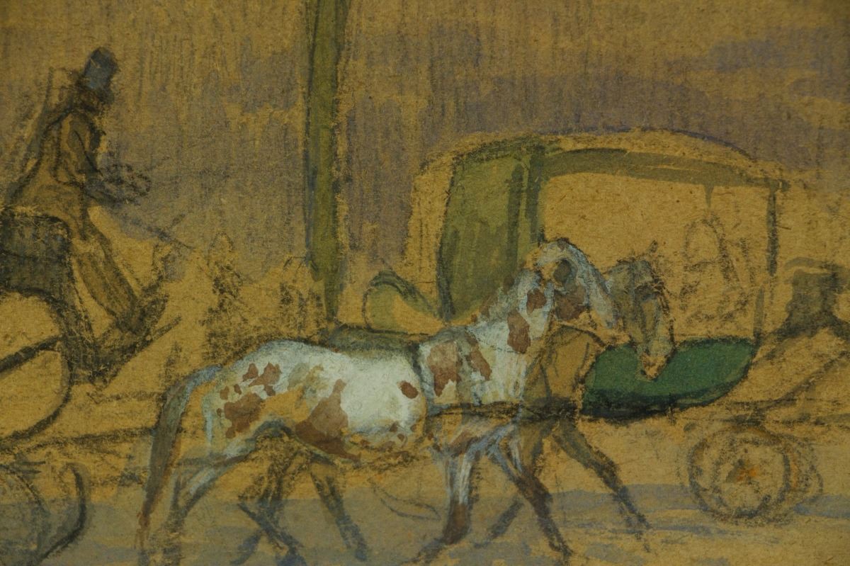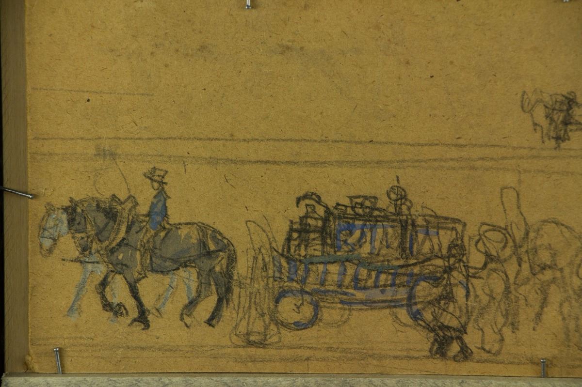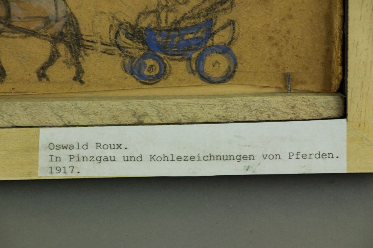 Horse wagons; watercolour on panel with frame; signed OROUX on lower right; with sketches on back; 37 cm × 13 cm