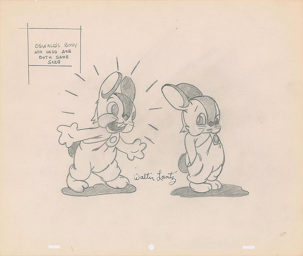 (Walter Lantz Studios, circa 1940s) Original pre-production model drawing of Oswald the Rabbit, signed later in black felt tip by Walter Lantz. The drawings show that Oswald's head and body are the same size. Accomplished in graphite on untrimmed 12.5 x 10.5 animation paper. In fine condition.