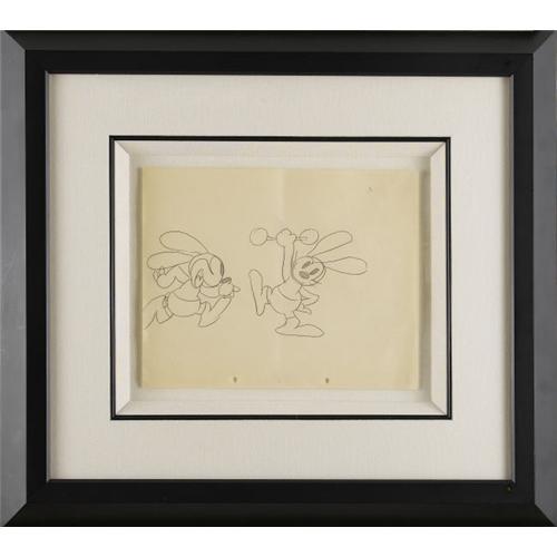 <B>Oswald the Rabbit Production Drawing Original Art (Walter Lantz Productions, undated).</B></I> This rough pencil image of Oswald and a friend is on paper with two peg holes at the bottom, and has an image area of 11.5" x 9". It comes in a beautiful frame and is in Excellent condition.