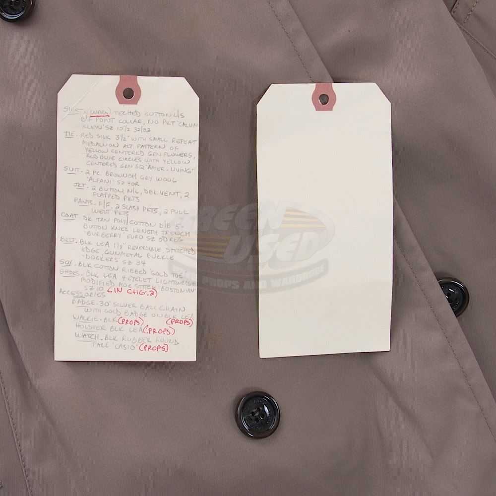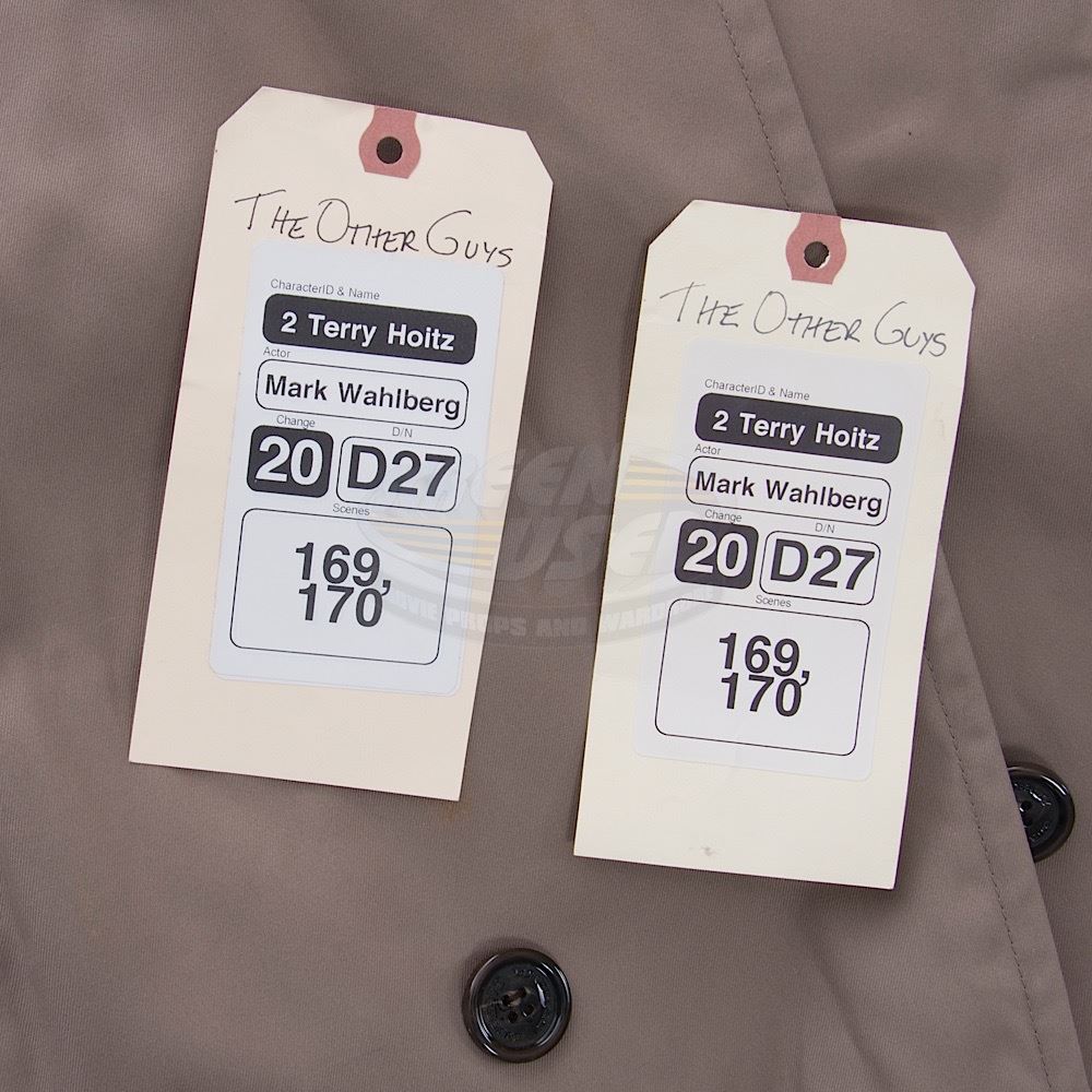 (Columbia Pictures, 2010) This outfit was acquired by the production for use by Mark Wahlberg as "Terry Hoitz". The outfit consists of a matching suit jacket and pants, a white long sleeve dress shirt, tie, overcoat and leather belt. Included with the outfit is two production used costume tags that detail the entire outfit, change and scene numbers used.