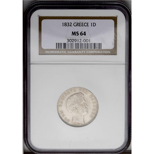 <B>Othon Drachma 1832, </B></I>KM15, MS64 NGC, a superb lightly toned example with glowing mint luster and exceptional eye appeal. The obverse does have some vague adjustment marks which are not distracting. Very rare and desirable in this quality.