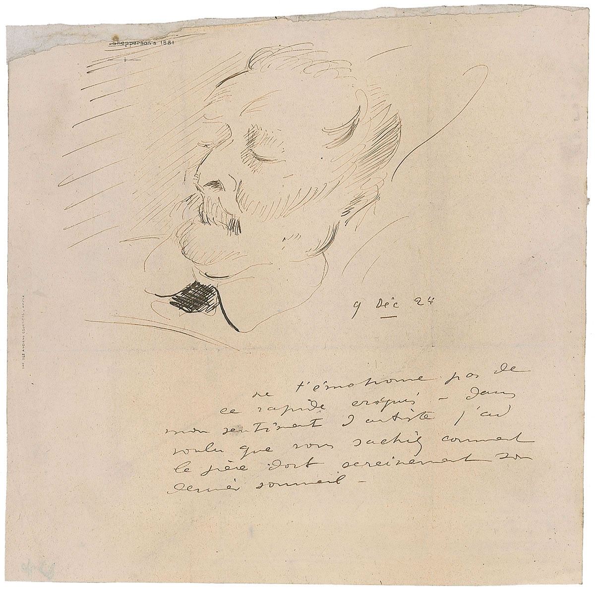 French artist (1879–1949) of the Fauvist movement and close friend of Raoul Dufy. Original ink sketch of his father on his deathbed on an off-white 8.25 x 8.25 sheet, dated December 9, 1924, with a brief note in French by Friesz below describing it, in part (translated): "I wanted to let you know how the father sleeps his last sleep peacefully." In fine condition, with edge repairs on the reverse showing along the top edge.