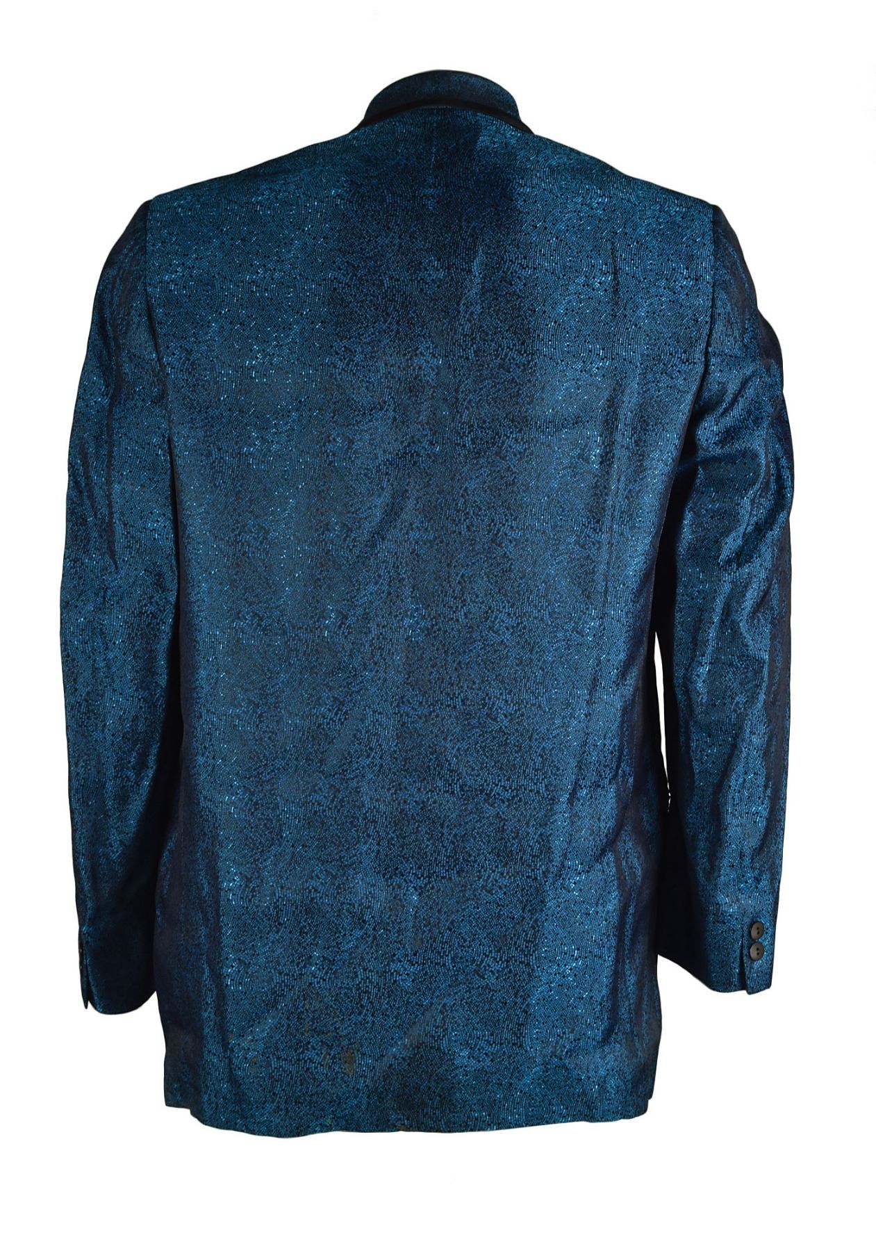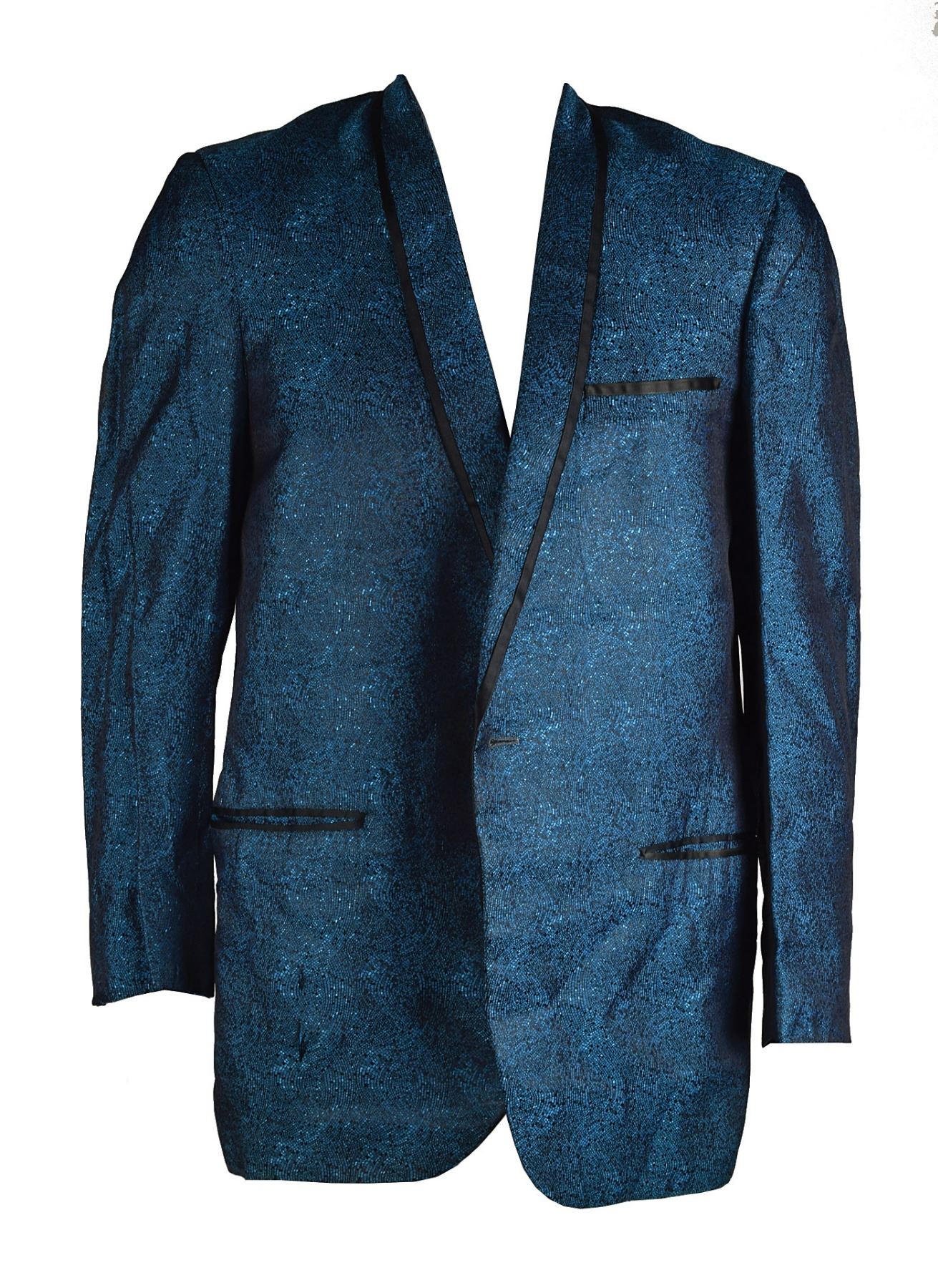 Midnight blue silk dinner jacket with a small mosaic design pattern, lined in black silk, with black piping on the lapels and pockets, worn on screen by a member of the Motown band Otis Day and The Knights in the iconic 1978 comedy Animal House. These jackets are seen when Otis Day and The Knights, 'the #1 Party Band in America,' sing 'Shama Lama Ding Dong.' In fine condition. Though best remembered for launching John Belushi's career into superstardom, Animal House also featured the then-fictional band 'Otis Day and The Knights,' which proved so popular that the actor who played Otis Day, DeWayne Jessie, formed a real band under the name.