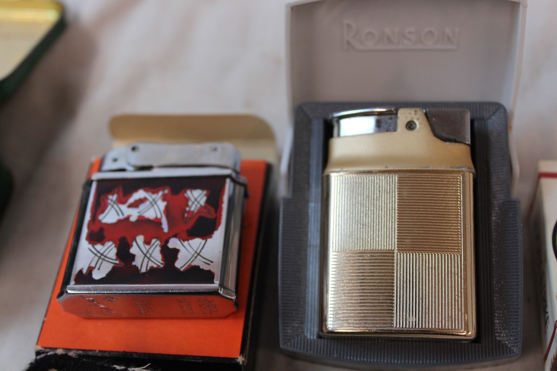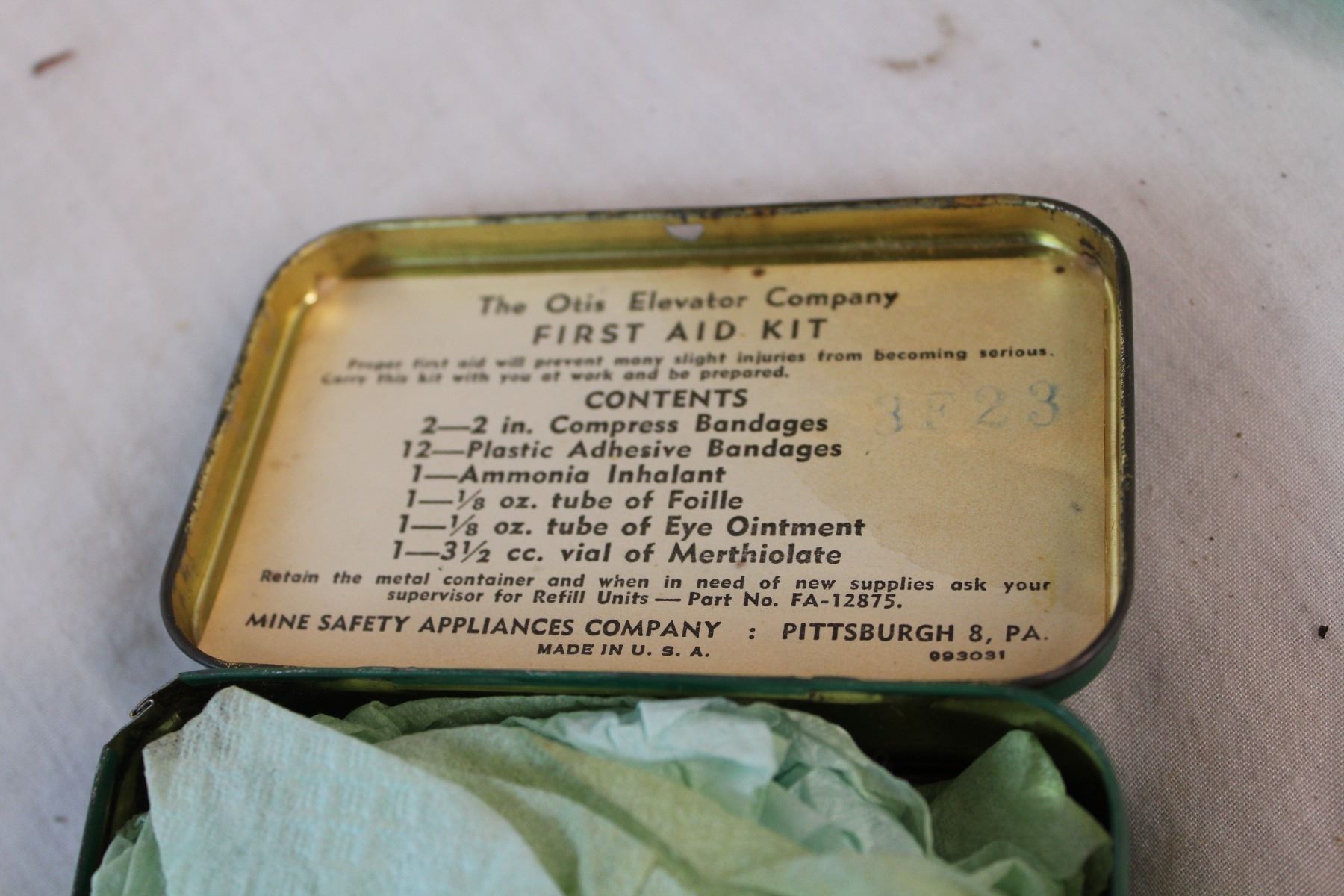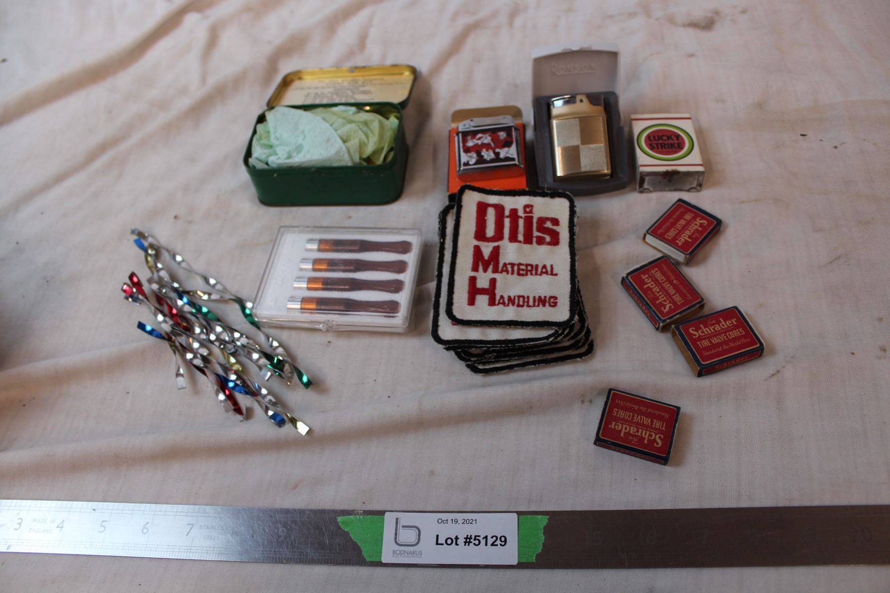 Otis Elevator company first aid kit, Ronson lighter, fisher lighter, schrader tire valve cores