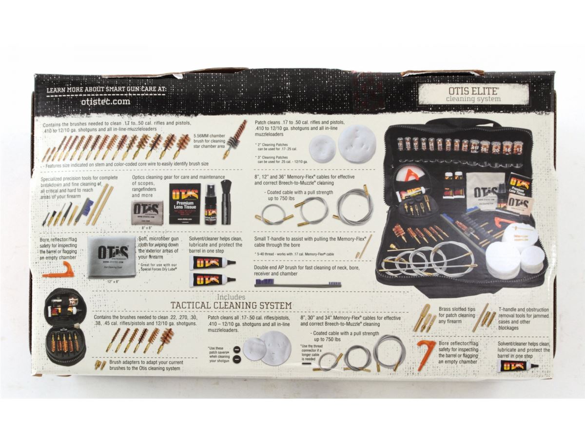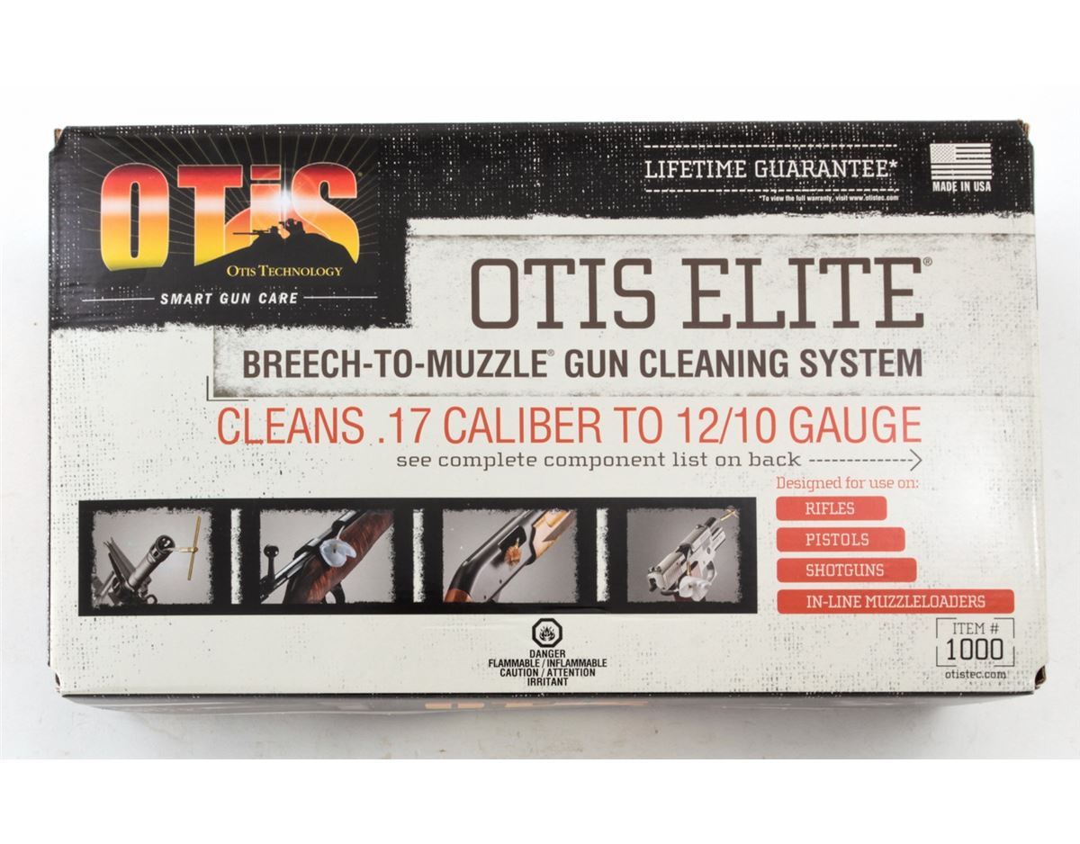 Otis Elite Breech-to-Muzzle Gun Cleaning System, cleans .17 cal. to 12/10 ga., in carrying case. Includes precision tools, brushes, Memory-Flex cable, solver/cleaner, etc. Brand new in original box. Retails at $144.95. Est.: $75-$125. (Field Time)