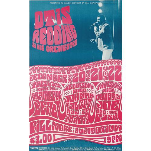 <B>Otis Redding Fillmore Concert Poster BG-43 (Bill Graham, 1966).</B></I> Who out there <I>doesn't</B></I> like Otis Redding? If you're one that doesn't, move on to the next lot while we Soul fans drool a while! Wes Wilson's graphics are loaded with psychedelic lettering, advertising Redding's opening acts: Grateful Dead on Tuesday, Johnny Talbot and De Thangs on Wednesday, and Country Joe and the Fish on Thursday. This version of the poster features the Bill Graham and Wilson credits printed in white, rather than the scarcer pink version (both are considered first printings), but we don't care -- it's great! It measures 14" x 22.5", and is in Near Mint condition.