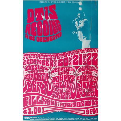 <B>Otis Redding/Grateful Dead Fillmore Auditorium Concert Poster, BG-43 (Bill Graham, 1966).</B></I> Those lucky enough to have been in the San Francisco area back in December 1966, would have had the chance to spend a few nights with one of the most powerful soul singers of all time -- Otis Redding. He appeared, with his orchestra, for a three-day run right before Christmas, with opening acts that included the Dead, Johnny Talbot and the Thangs, and Country Joe and the Fish. By the following Christmas, this Macon, Georgia native would be gone, the victim of a plane crash. This single-printing poster is the more-common "white credit" version, as listed in Eric King's book on Rock posters. It measures approximately 14" x 22.5", and is in NM- condition.<BR><BR><b>Shipping:</b> Flat Material, Large (<a target="_blank" href="http://www.heritageauctions.com/common/shipping.php">view shipping information</a>)