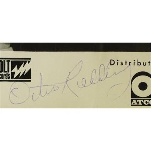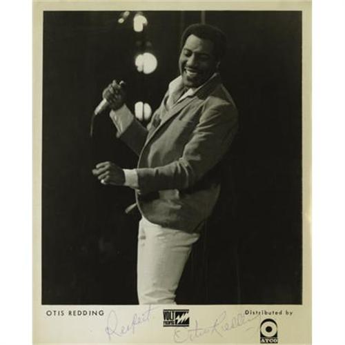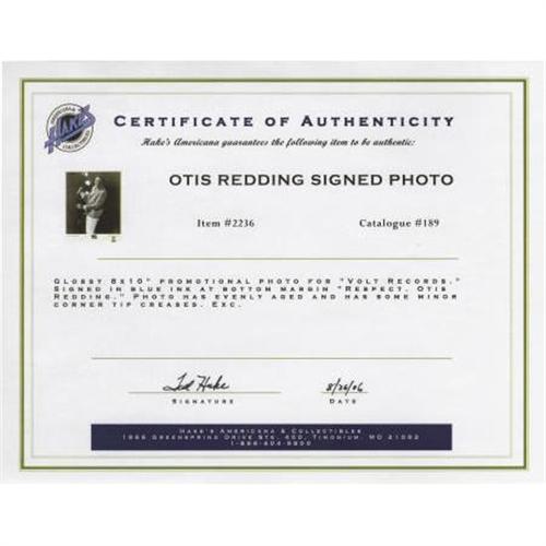 <B>Otis Redding Signed Photo.</B></I> A b&w 8" x 10" photo of the late Soul singer, inscribed and signed by him in blue ballpoint. In Very Fine condition with mild toning and corner creases. <I>Accompanied by a certificate of authenticity From Hake's Collectibles.</B></I><BR><BR><b>Shipping:</b> Flat Material, Small (<a target="_blank" href="http://www.heritageauctions.com/common/shipping.php">view shipping information</a>)