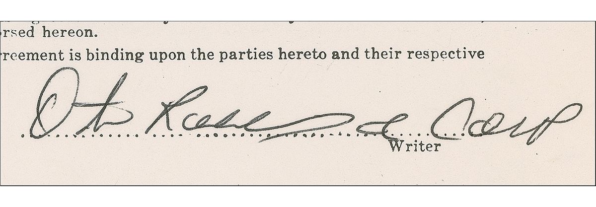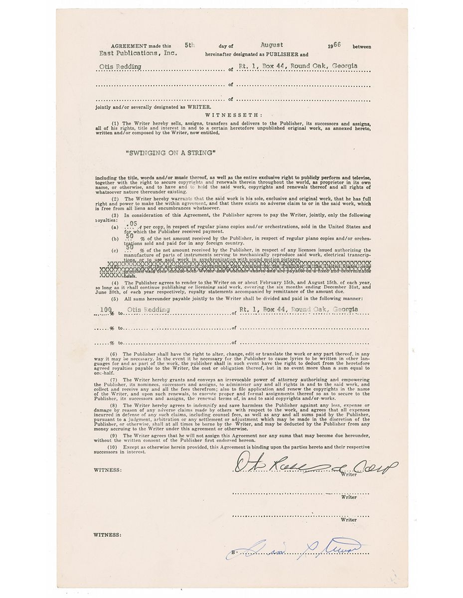 Singer, known as the “King of Soul,” who died tragically in a plane crash at the age of 26; a month thereafter ‘(Sittin’ On) The Dock of the Bay’ was posthumously released and became his only number one single. DS, signed “Otis Redding, Jr, Comp” one page, 8.5 x 14, August 5, 1966. Royalties agreement between Redding and East Publications Inc. in which Redding sells the rights to his song, ‘Swinging On A String,’ with Redding receiving five cents per copy of piano copies and orchestration, 50% of all foreign sales, and mechanical reproductions. Agreement further states that Redding receives 100% of the money. Neatly signed at the bottom in black ink by Redding. In fine condition, with a few light wrinkles and bends. The song ‘Swinging on a String,’ appears on Redding’s 1970 posthumously released album Tell The Truth.