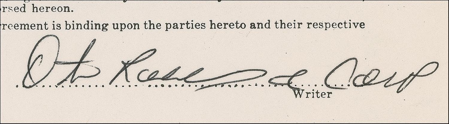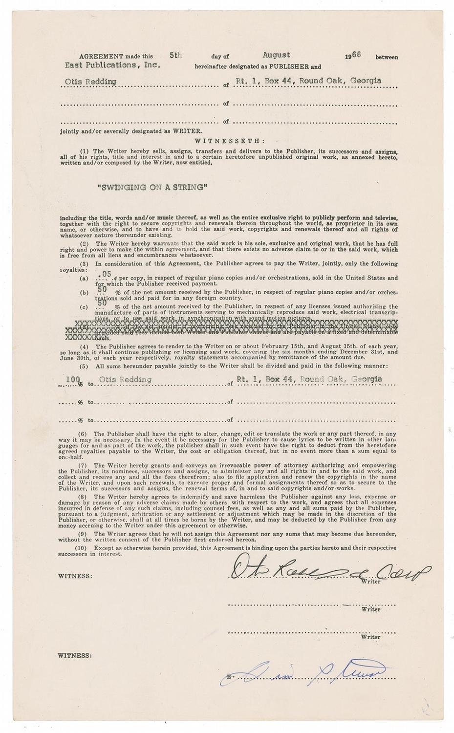 Singer, known as the “King of Soul,” who died tragically in a plane crash at the age of 26; a month thereafter “(Sittin’ On) The Dock of the Bay” was posthumously released and became his only number one single. DS, signed “Otis Redding, Jr, Comp” one page, 8.5 x 14, August 5, 1966. Royalties agreement between Redding and East Publications Inc. in which Redding sells the rights to his song, ‘Swinging On A String,’ with Redding receiving five cents per copy of piano copies and orchestration, 50% of all foreign sales, and mechanical reproductions. Agreement further states that Redding receives 100% of the money. Neatly signed at the bottom in black ink by Redding. In fine condition, with a few light wrinkles and bends. The song ‘Swinging on a String,’ appears on Redding’s 1970 posthumously released album Tell The Truth.