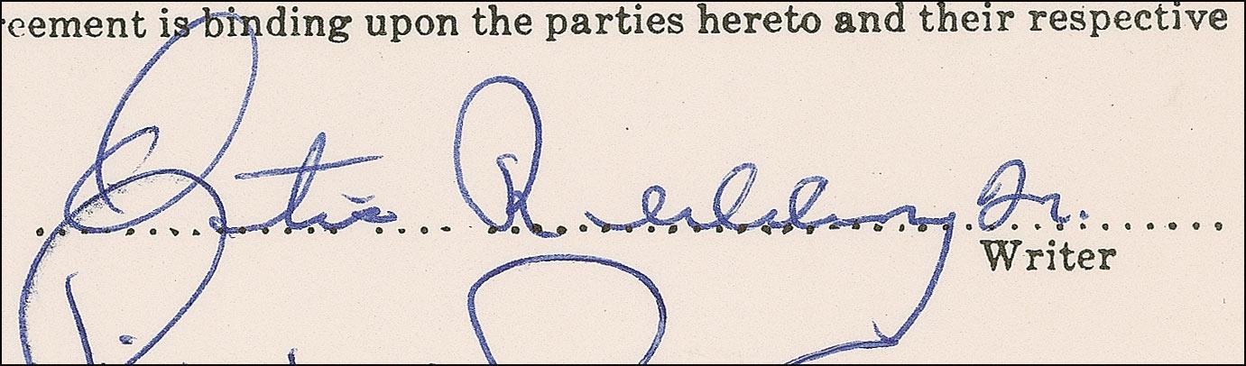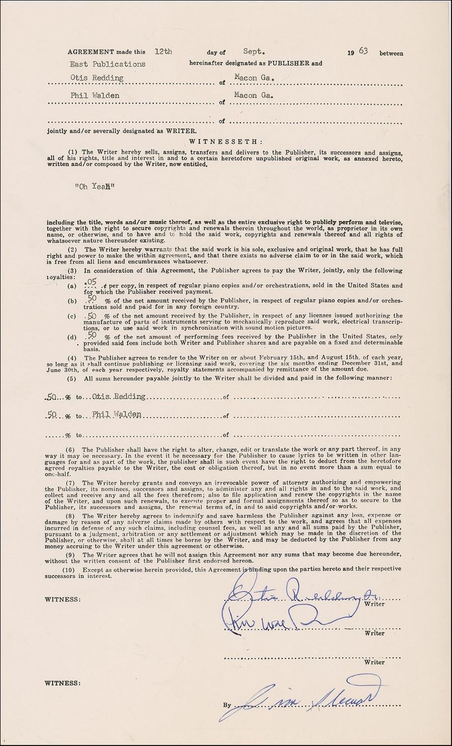 Singer, known as the ‘King of Soul,’ who died tragically in a plane crash at the age of 26; a month later ‘(Sittin’ On) The Dock of the Bay’ was posthumously released and became his only number one single. DS, signed “Otis Redding, Jr.,” one page, 8.5 x 14, September 12, 1963. Royalties agreement between Redding, Phil Walden and East Publications Inc. in which they sell the rights to their song, ‘Oh Yeah,’ receiving five cents per copy of piano copies and orchestration, 50% of all foreign sales, performing fees,and mechanical reproductions. Redding and Walden will split the royalties 50-50. Signed at the conclusion by Redding and Walden. In fine condition, with a central horizontal crease, and a light diagonal crease to top portion. Walden was co-founder of Capricorn Records and served as Redding’s manager from 1959 until Redding's death in 1967.