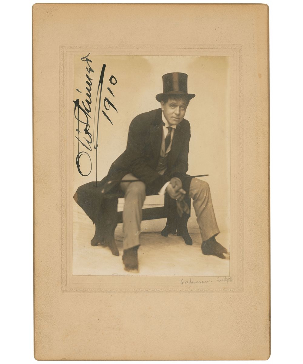 Vintage matte-finish 4 x 5.5 photo of Skinner sitting on a bench with a top hat and walking stick, affixed to its original 6 x 9 mount, signed vertically on the image in fountain pen, “Otis Skinner 1910.” Mount bears a small photographer’s pencil notation under image. Silvering to darker areas of image, repair on reverse of creases to lower right corner, and some light soiling to mount, otherwise fine condition.