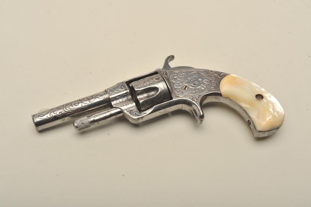 round barrel, pearl grips, S/N 10502, in overall good to very good condition with a crisp action, extensive coverage of engraving, beautiful iridescent pearl grips; contained in a wood presentation casing with purple lining. (Antique). Est.: $1,000-$2,000.