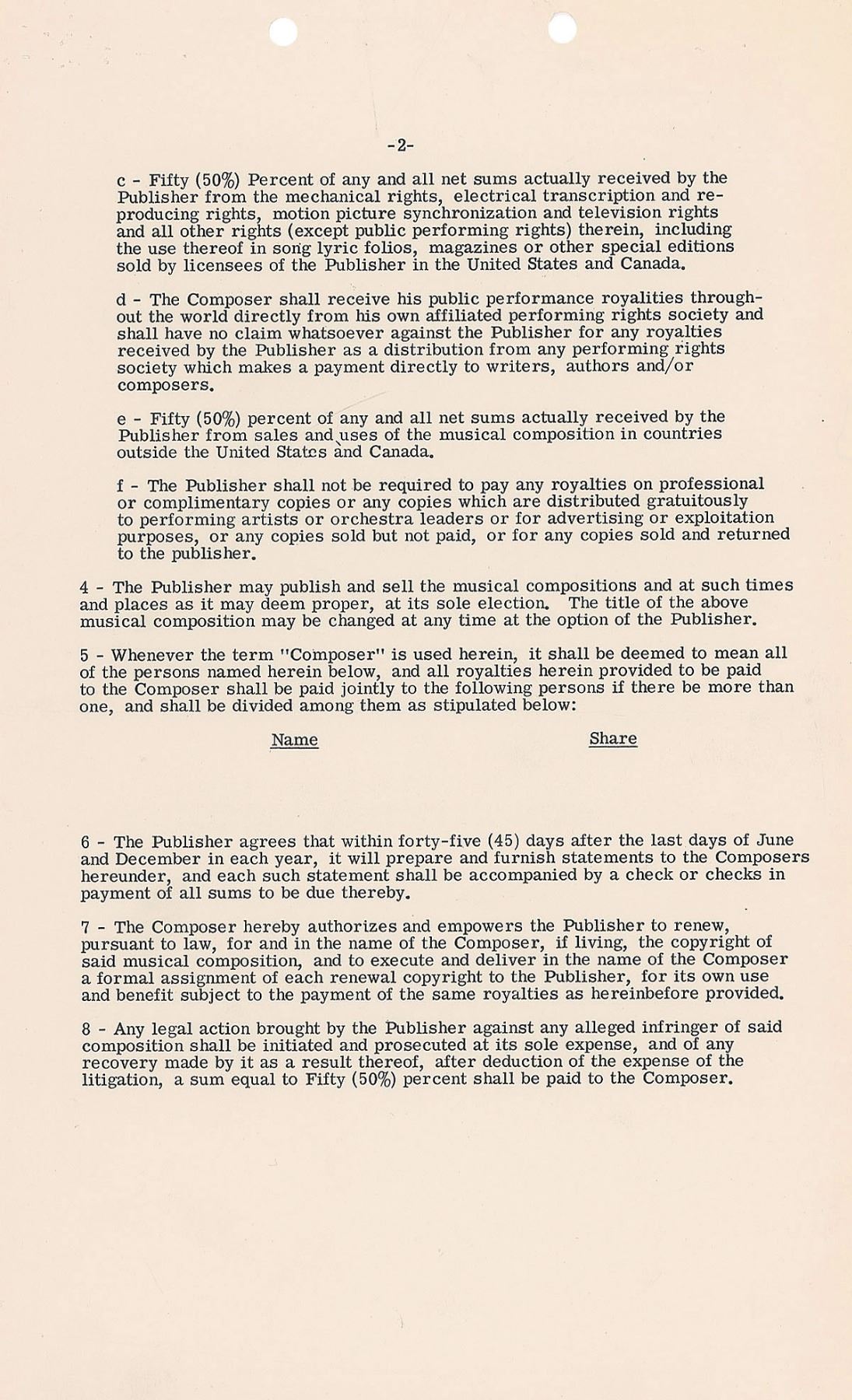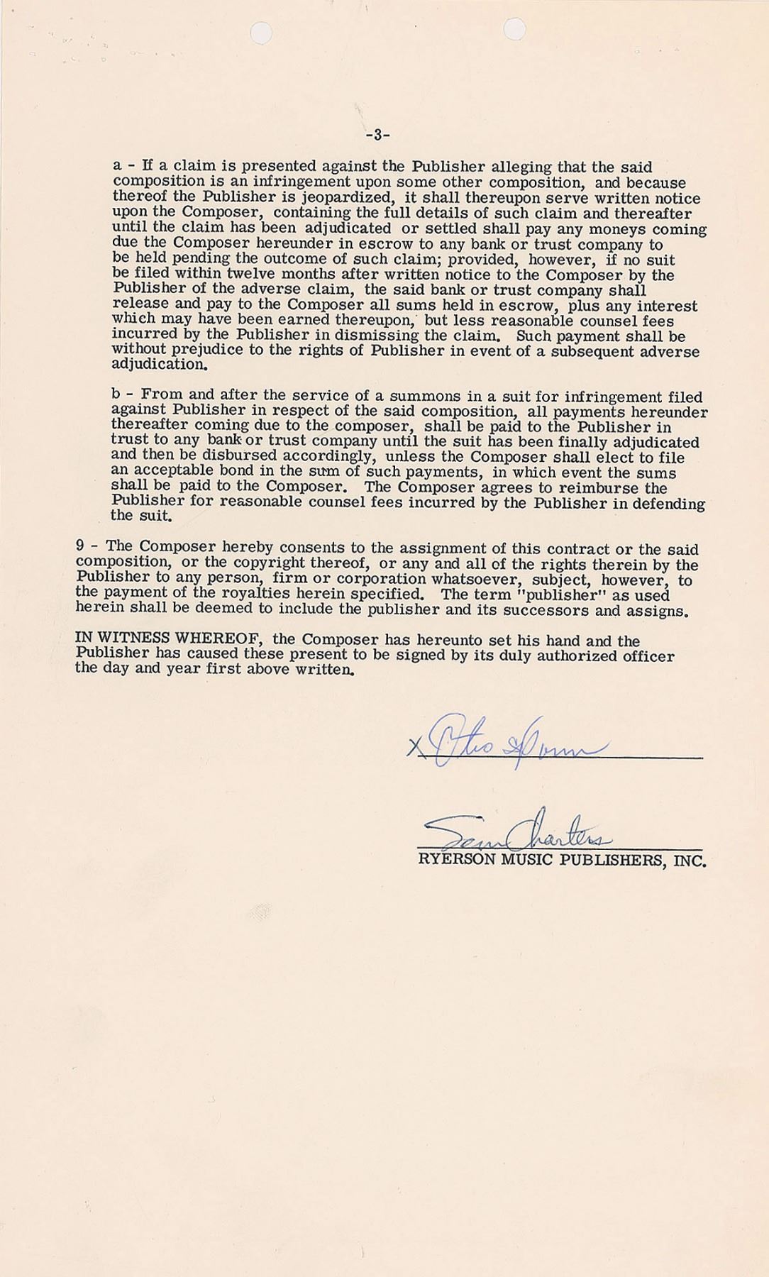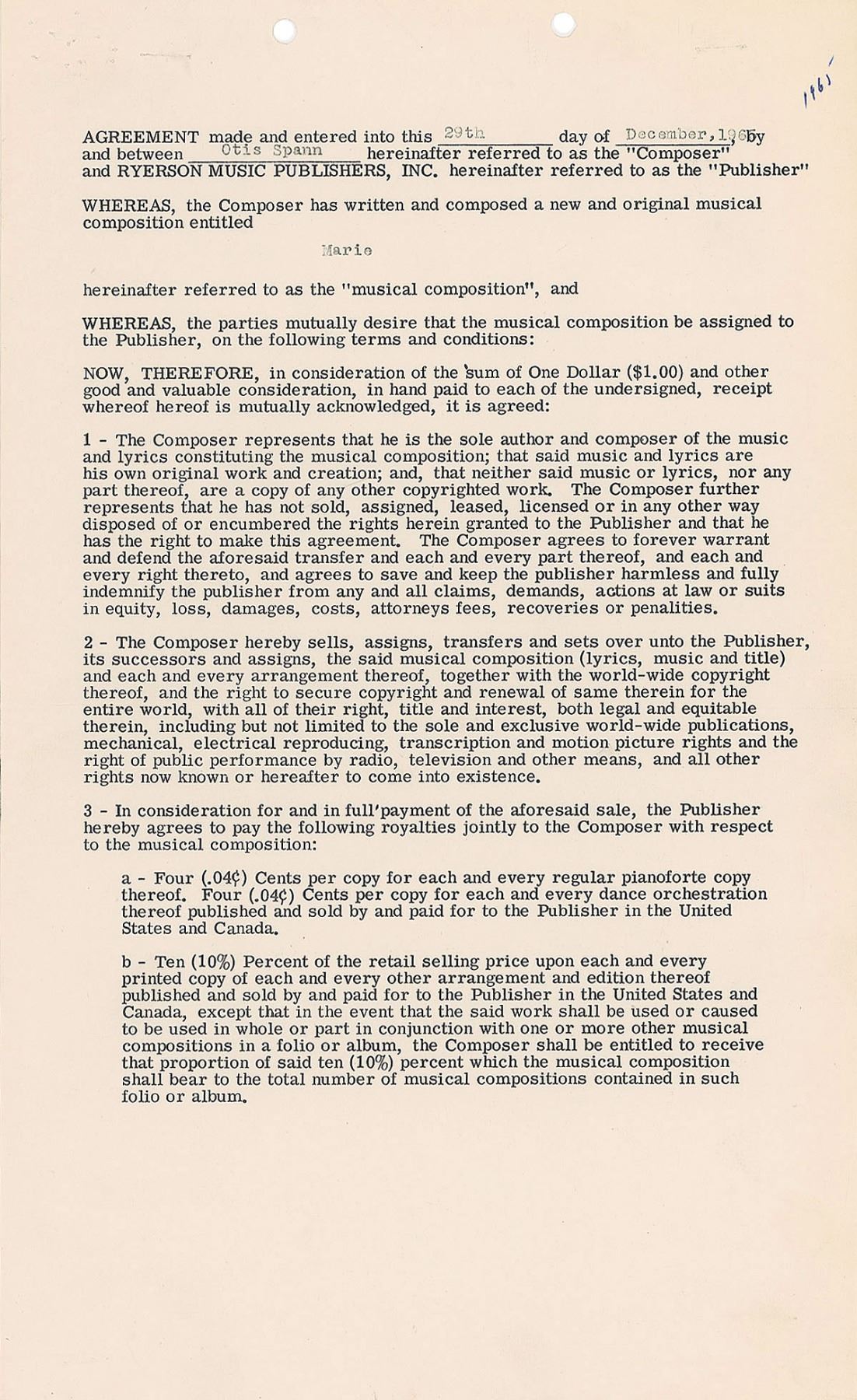 Blues pianist (1930–1970) who was a longtime member of Muddy Waters’s band. Spann was memorably featured on Fleetwood Mac’s 1969 album Biggest Thing Since Colossus. DS, three pages, 8.5 x 14, December 29, 1965. Agreement between Spann and Ryerson Music Company for the sale of a song entitled ‘Marie’ for the price of one dollar. Spahn will receive royalties for piano copies, printed arrangements, mechanical rights, and for the song’s performances. Signed on the last page in blue ballpoint by Spann and countersigned by a company executive. In fine condition, with usual document wear.