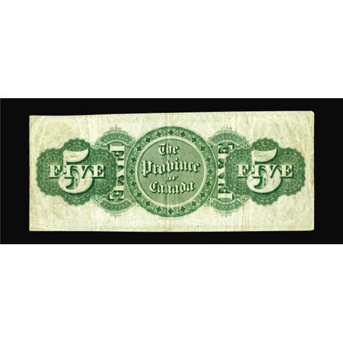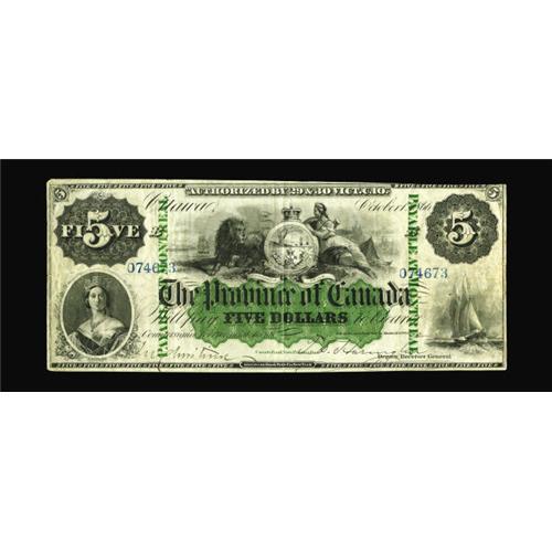 <B>PC-4a $5 1866</B></I><BR>Our consignor believes this to be the finest known example of this very elusive Province of Canada issue 1866, and it might well be. This is a lovely and totally original piece with great color, paper quality, and eye appeal, and we certainly know of no finer example. This Montreal issue is priced only through Very Fine in the new Charlton reference, and we fully expect this beauty to exceed the $22,500 figure that appears there. <B>Very Fine.</B></I><BR><I>From The Halton Lake Collection</B></I>