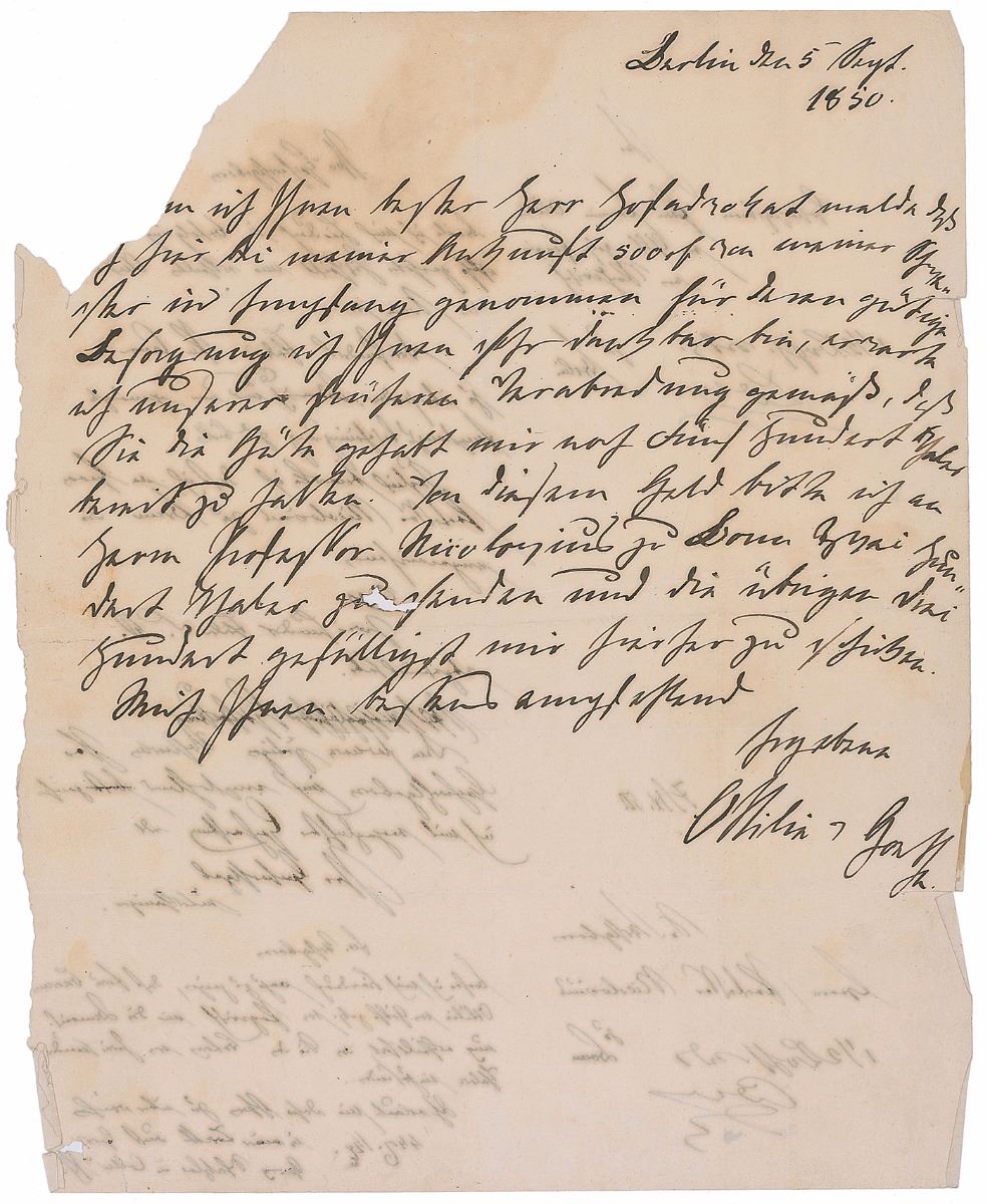 Daughter of Johann Wolfgang von Goethe (1796–1872). ALS in German, signed “Ottilie v. Goethe,” one page, 8.75 x 11, September 5, 1850. Untranslated letter to to the Court Advocate in Weimar regarding a financial matter. Several notes in other hands are penned on the reverse. In very good condition, with intersecting folds, a large area of paper loss to the upper left corner affecting portions of the text, small edge tears and area of paper loss to the center, show-through from writing to reverse, and light dampstaining to upper portion.