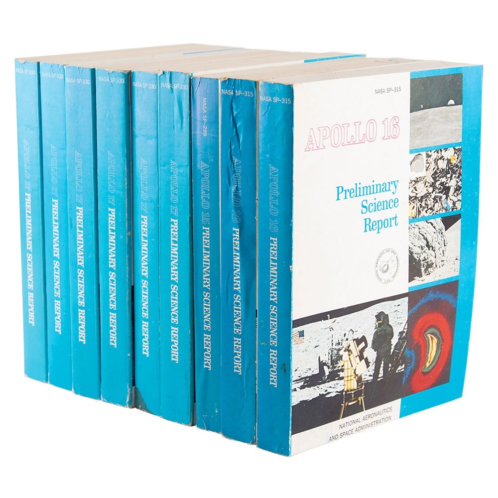 Otto Berg's set of Project Apollo Preliminary Science Reports for all successful lunar landing missions, all softcovers, with several duplicates included. Includes: one copy of Apollo 11 Preliminary Science Report (NASA SP-214); one copy of Apollo 12 Preliminary Science Report (NASA SP-235); three copies of Apollo 14 Preliminary Science Report (NASA SP-272); two copies of Apollo 15 Preliminary Science Report (NASA SP-289); two copies of Apollo 16 Preliminary Science Report (NASA SP-315); and six copies of Apollo 17 Preliminary Science Report (NASA SP-330). Many are annotated on the front cover or edges with Berg's name, and the Apollo 11 report is stampde "Jet Propulsion Laboratory Library." In overall very good condition, with scattered foxing, dampstaining, and creasing to spines.